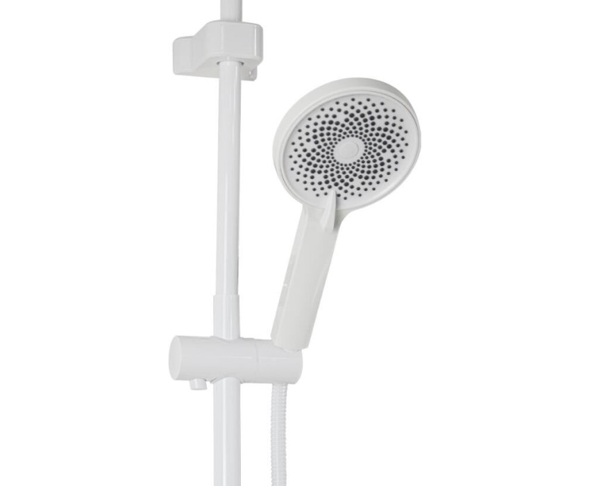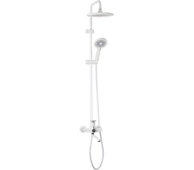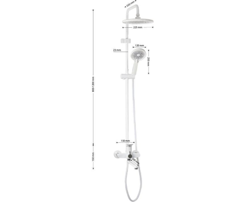 Смеситель + стойка душевая телескопическая "тропический душ" с двумя лейками в ванную / душевую комнату, хромированный с покрытием белая эмаль. Смеситель шаровый с длинным поворотным изливом, душевым шлангом и лейкой, дивертор переключения в трёх положениях. Материал изготовления — латунь. Картридж d = 40 мм, ручка литая, аэратор для экономии воды, чашки и эксцентрики. Душевая, регулируемая по высоте стойка с присоединением к корпусу смесителя и дополнительным креплением к стене и большой круглой лейкой с эффектом тропического душа. Габаритные размеры: ширина смесителя 150 мм, высота 150 мм, длина излива корпуса 300 мм, высота телескопической стойки 800-1200 мм, длина излива стойки 320 мм, круглая душевая лейка 120 мм, круглая лейка тропический душ 225 мм, шланг 150 см. Вес - 4.12 кг, объём - 0.02847 м3. В комплекте корпус с изливом, чашки, эксцентрики, прокладки, стойка, дивертор, шланг, две лейки, крепления.