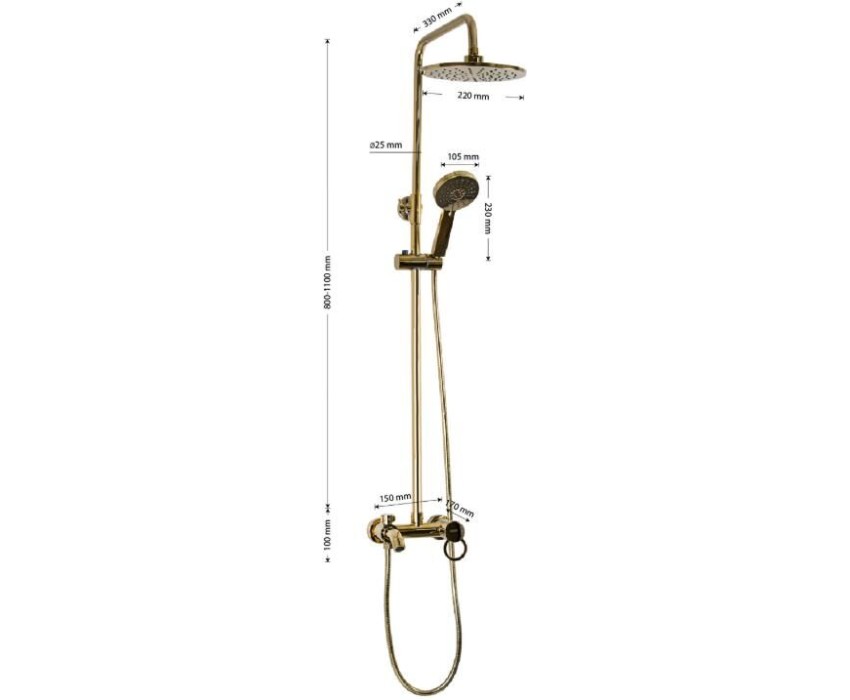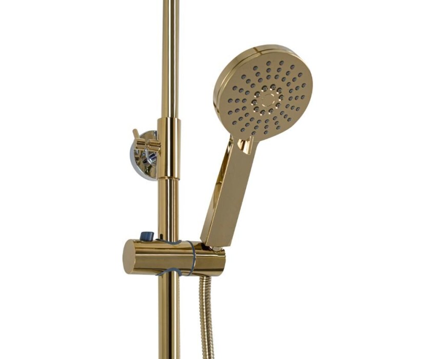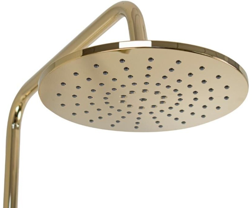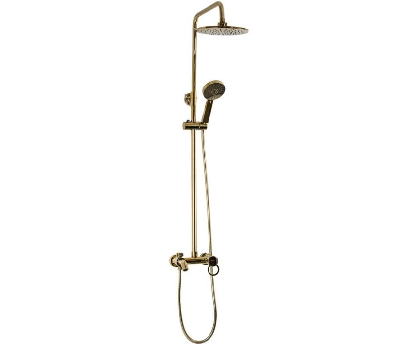 Смеситель + стойка душевая "тропический душ" с двумя лейками в ванную, цвет под золото. В дизайне душевой стойки гармонично соединились строгие линии и мягкие переходы. Она отлично впишется в интерьер ванной комнаты в минималистическом стиле. Глянцевое покрытие под состаренную бронзу не стирается и сохраняет первозданный внешний вид в течение всего периода эксплуатации. Длительную работу без протечек обеспечивает смеситель с керамическим картриджем. Предусмотрен излив для наполнения ванны. Угол наклона верхнего душа можно регулировать в соответствии с потребностями каждого пользователя. Ручная лейка оснащена металлическим шлангом, который не перекручивается во время водных процедур. Смеситель шаровый с коротким изливом, душевым шлангом и лейкой и дивертор переключения в трёх положениях. Картридж d = 35 мм, ручка с кольцом, аэратор для экономии воды, чашки и эксцентрики. Душевая стойка с присоединением к корпусу смесителя и дополнительным креплением к стене и большой круглой лейкой с эффектом тропического душа