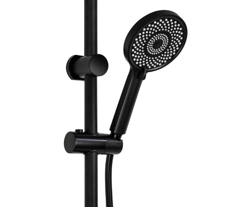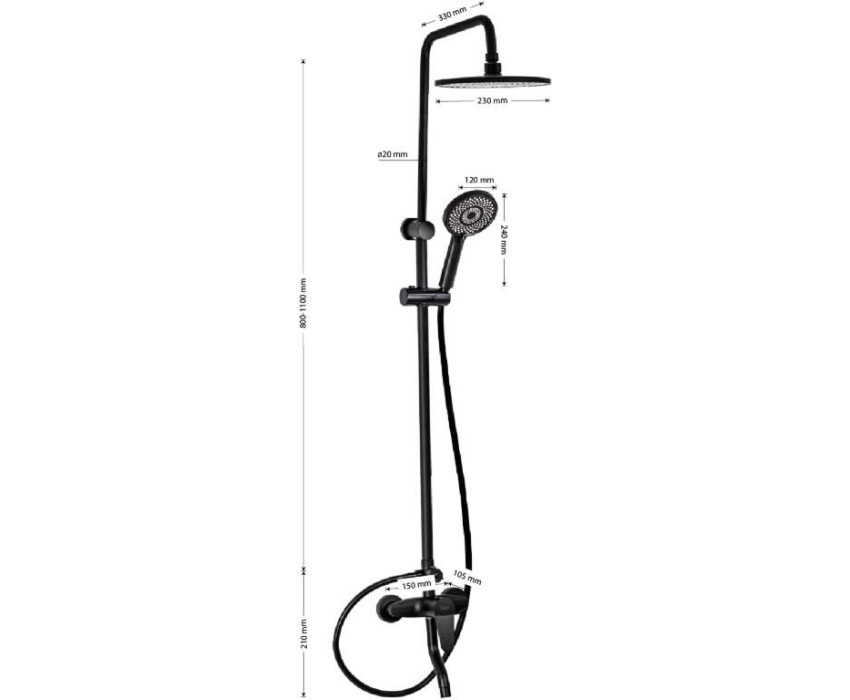 Смеситель + стойка душевая телескопическая "тропический душ" с двумя лейками в ванную / душевую комнату, черный. Смеситель шаровый, пластик АБС с коротким поворотным изливом, душевым шлангом и лейкой и дивертор переключения в трёх положениях. Картридж d = 35 мм, ручка литая, аэратор для экономии воды, чашки и эксцентрики. Душевая, регулируемая по высоте стойка с присоединением к корпусу смесителя и дополнительным креплением к стене и крючками для принадлежностей и большой круглой лейкой с эффектом тропического душа. Габаритные размеры: ширина смесителя 150 мм, высота 210 мм, длина излива корпуса 105 мм, высота телескопической стойки 800 - 1100 мм, длина излива стойки 330 мм, круглая двухрежимная душевая лейка d = 230 мм, круглая лейка тропический душ d = 120 мм, шланг 150 см. Вес - 3,2 кг, объём - 0,03133 м3. В комплекте корпус с изливом, чашки, эксцентрики, прокладки, стойка, дивертор, шланг, две лейки, крепления.