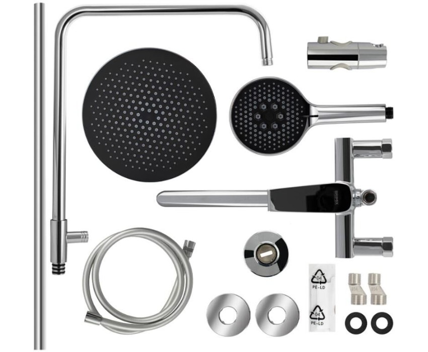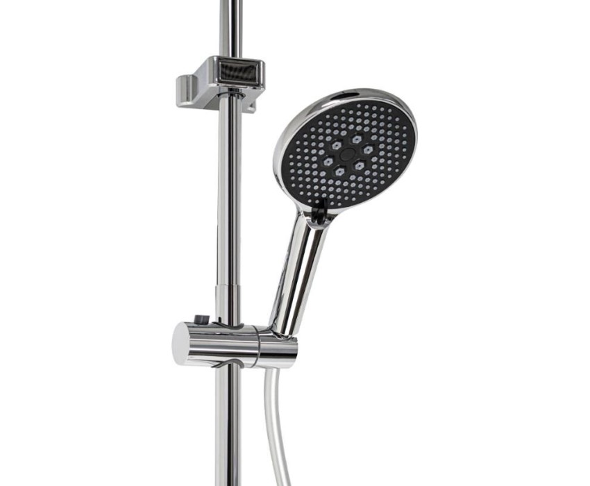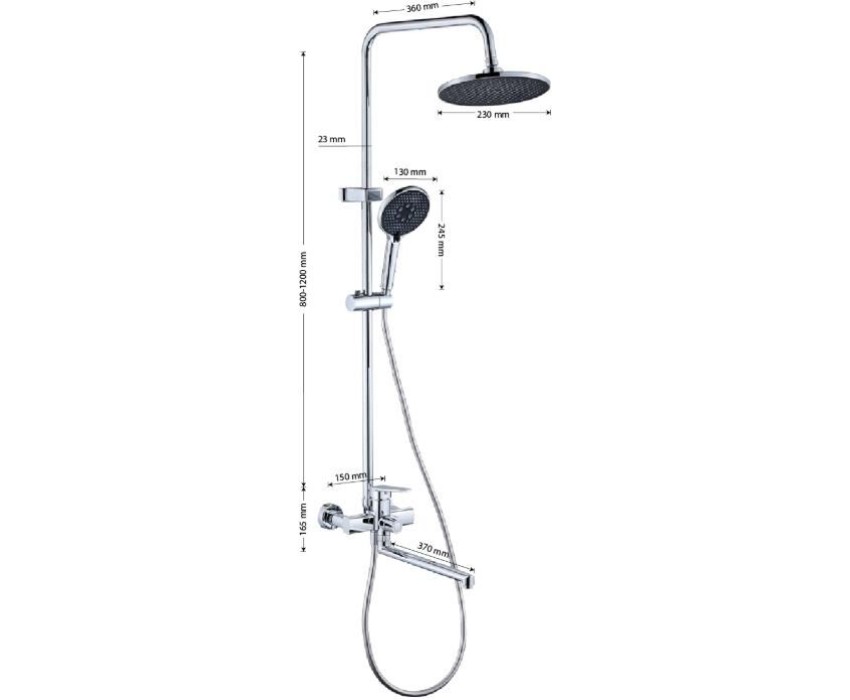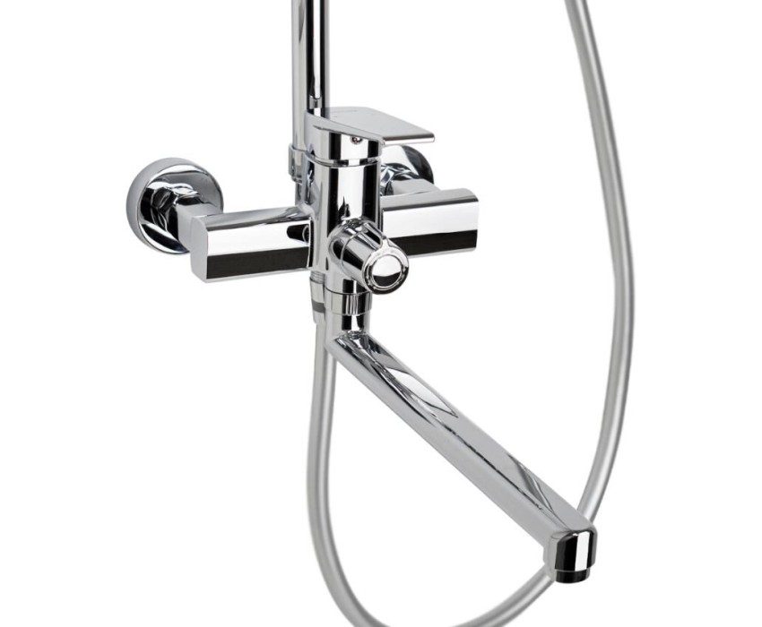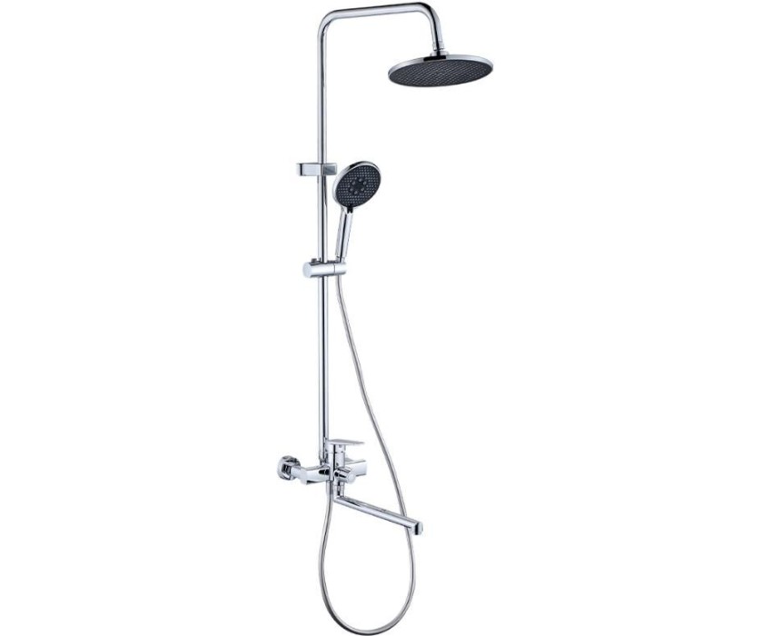 Смеситель + стойка душевая телескопическая "тропический душ" с двумя лейками в ванную / душевую комнату, хромированная. Смеситель шаровый, пластик АБС с поворотным длинным изливом, душевым шлангом и лейкой и дивертор переключения в трёх положениях. Картридж d = 35 мм, ручка литая, аэратор для экономии воды, чашки и эксцентрики. Душевая, регулируемая по высоте стойка с присоединением к корпусу смесителя и дополнительным креплением к стене и крючками для принадлежностей и большой круглой лейкой с эффектом тропического душа. Габаритные размеры: ширина смесителя 150 мм, высота 165 мм, длина излива корпуса 370 мм, высота телескопической стойки 800-1200 мм, длина излива стойки 360 мм, круглая двухрежимная душевая лейка d = 130 мм, круглая лейка тропический душ d = 230 мм, шланг 150 см. Вес - 3.15 кг, объём - 0.02941 м3. В комплекте корпус с изливом, чашки, эксцентрики, прокладки, стойка, дивертор, шланг, две лейки, крепления.