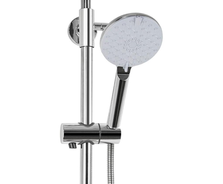 Смеситель + стойка душевая "тропический душ" с двумя лейками в ванную, хромированные. В дизайне душевой стойки гармонично соединились строгие линии и мягкие переходы. Она отлично впишется в интерьер ванной комнаты в минималистичном стиле. Глянцевое хромированное покрытие не стирается и сохраняет первозданный внешний вид в течение всего периода эксплуатации. Длительную работу без протечек обеспечивает смеситель с керамическим картриджем. Предусмотрен поворотный излив для наполнения ванны. Угол наклона верхнего душа можно регулировать в соответствии с потребностями каждого пользователя. Ручная лейка оснащена металлическим шлангом, который не перекручивается во время водных процедур. Смеситель шаровый с коротким поворотным изливом, душевым шлангом и лейкой и дивертор переключения в трёх положениях. Картридж d = 35 мм, ручка литая, аэратор для экономии воды, чашки и эксцентрики. Душевая стойка с присоединением к корпусу смесителя и дополнительным креплением к стене и большой круглой лейкой с эффектом тропического