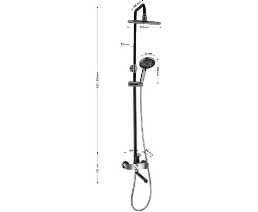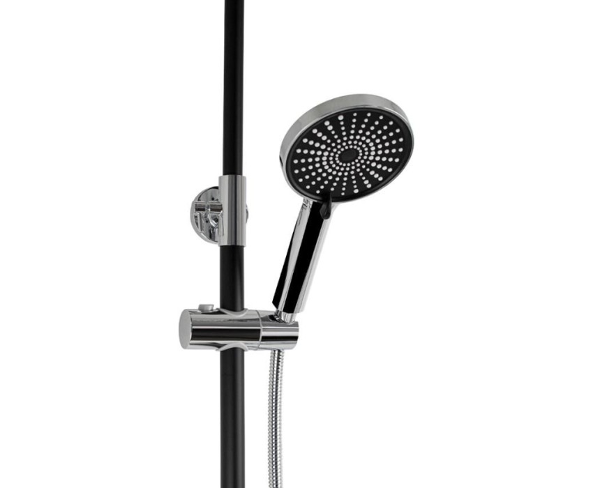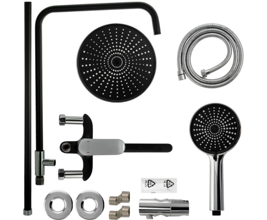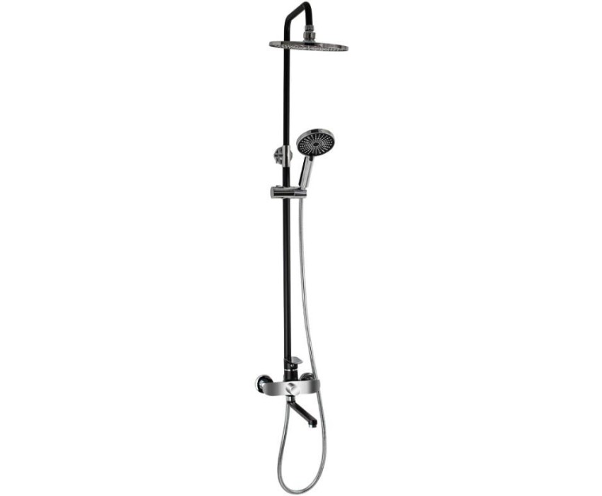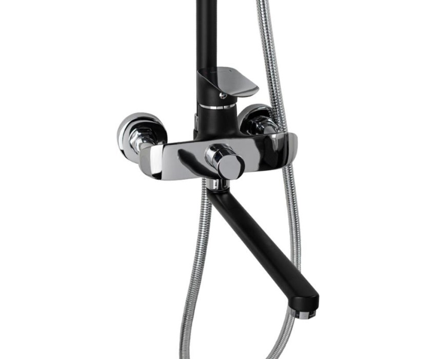 Смеситель + стойка душевая "тропический душ" с двумя лейками, комбинированного цвета - черный / хром, в ванную, с длинным изливом. В дизайне душевой стойки гармонично соединились строгие линии и мягкие переходы. Она отлично впишется в интерьер ванной комнаты в минималистическом стиле. Глянцевое хромированное покрытие не стирается и сохраняет первозданный внешний вид в течение всего периода эксплуатации. Длительную работу без протечек обеспечивает смеситель с керамическим картриджем. Предусмотрен поворотный излив для наполнения ванны. Угол наклона верхнего душа можно регулировать в соответствии с потребностями каждого пользователя. Ручная лейка оснащена металлическим шлангом, который не перекручивается во время водных процедур. Смеситель шаровый с длинным поворотным изливом, душевым шлангом и лейкой и дивертор переключения в трёх положениях. Картридж d = мм, ручка литая, аэратор для экономии воды, чашки и эксцентрики. Душевая стойка с присоединением к корпусу смесителя и дополнительным креплением к стене и бо