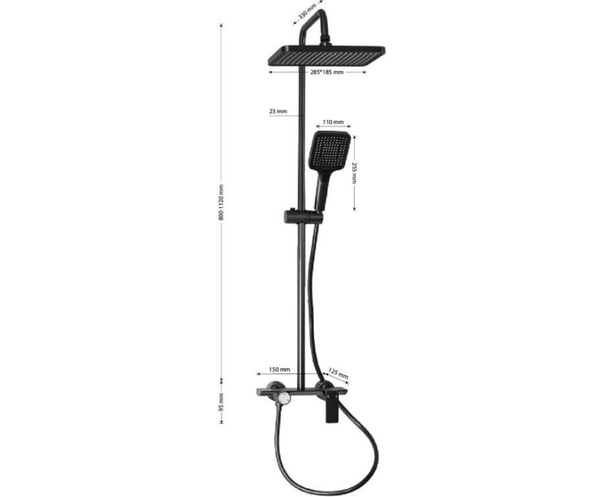 Смеситель + стойка душевая "тропический душ" с двумя лейками цвет графит. В дизайне душевой стойки гармонично соединились строгие линии и мягкие переходы. Она отлично впишется в интерьер ванной комнаты в минималистическом стиле. Покрытие не стирается и сохраняет первозданный внешний вид в течение всего периода эксплуатации. Длительную работу без протечек обеспечивает смеситель с керамическим картриджем. Угол наклона верхнего душа можно регулировать в соответствии с потребностями каждого пользователя. Ручная лейка оснащена металлическим шлангом, который не перекручивается во время водных процедур. Смеситель с душевым шлангом и лейкой и дивертор переключения в трёх положениях. Картридж d = мм, ручка с кольцом, аэратор для экономии воды, чашки и эксцентрики. Душевая стойка с присоединением к корпусу смесителя и дополнительным креплением к стене и большой круглой лейкой с эффектом тропического душа. Габаритные размеры: ширина смесителя 150 мм, высота 95 мм, длина излива корпуса 125 мм, высота стойки 800-1120 мм, длина излива стойки 330 мм, верхняя душевая лейка 285*185 мм, лейка душевая 100*255 мм, шланг душевой 150 см. Вес 3,16 кг, объем 0,02537 м3.