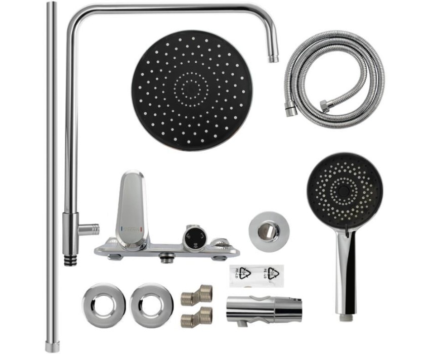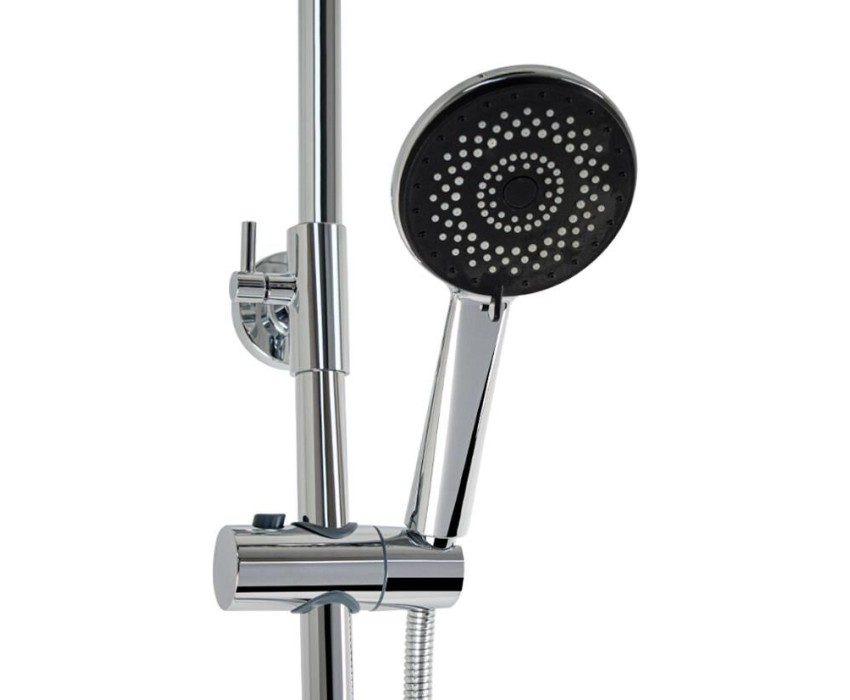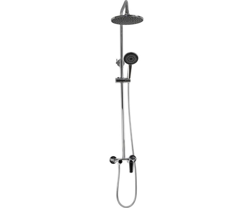 Смеситель + стойка душевая "тропический душ" с двумя лейками в ванную, хромированные. В дизайне душевой стойки гармонично соединились строгие линии и мягкие переходы. Она отлично впишется в интерьер ванной комнаты в минималистическом стиле. Глянцевое хромированное покрытие не стирается и сохраняет первозданный внешний вид в течение всего периода эксплуатации. Длительную работу без протечек обеспечивает смеситель с керамическим картриджем. Угол наклона верхнего душа можно регулировать в соответствии с потребностями каждого пользователя. Ручная лейка оснащена металлическим шлангом, который не перекручивается во время водных процедур. Смеситель с душевым шлангом и лейкой и дивертор переключения в трёх положениях. Картридж d = мм, ручка с кольцом, аэратор для экономии воды, чашки и эксцентрики. Душевая стойка с присоединением к корпусу смесителя и дополнительным креплением к стене и большой круглой лейкой с эффектом тропического душа. Габаритные размеры: ширина смесителя 150 мм, высота 100 мм, длина корпуса 83 м