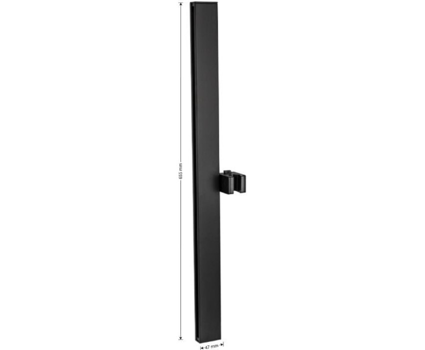 Душевая стойка, глянцевая, квадратный профиль, цвет черный, произведена из высокопрочного АБС пластика, устойчивой к агрессивному воздействию внешней среды и механическим деформациям, держатель для душа с механической фиксацией и регулировкой по высоте. Размеры: высота штанги 655 мм, глубина 20 мм, ширина трубы 47 мм, расстояние между креплением 605 мм. Вес - 0.50 кг, объём - 0.00495 м3. В комплекте душевая штанга, крепления, держатель душевой лейки.