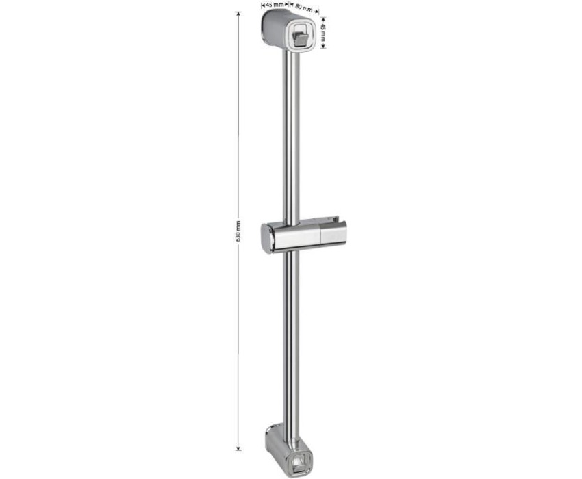 Душевая стойка, глянцевая, хромированная, с выдвижными крючками, произведена из нержавеющей стали марки 304, устойчивой к агрессивному воздействию внешней среды и механическим деформациям, держатель для душа с кнопочной фиксацией и регулировкой по высоте. Расстояние между настенными креплениями регулируется, что позволяет использовать в процессе монтажа отверстия, имеющиеся в стене. Размеры: высота штанги 630 мм, глубина 80 мм, диаметр трубы 21 мм, крепление 45*45 мм. Вес - 0,48 кг, объём - 0,00496 м3. В комплекте душевая штанга, крепления, держатель душевой лейки.