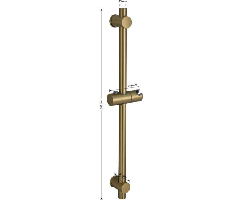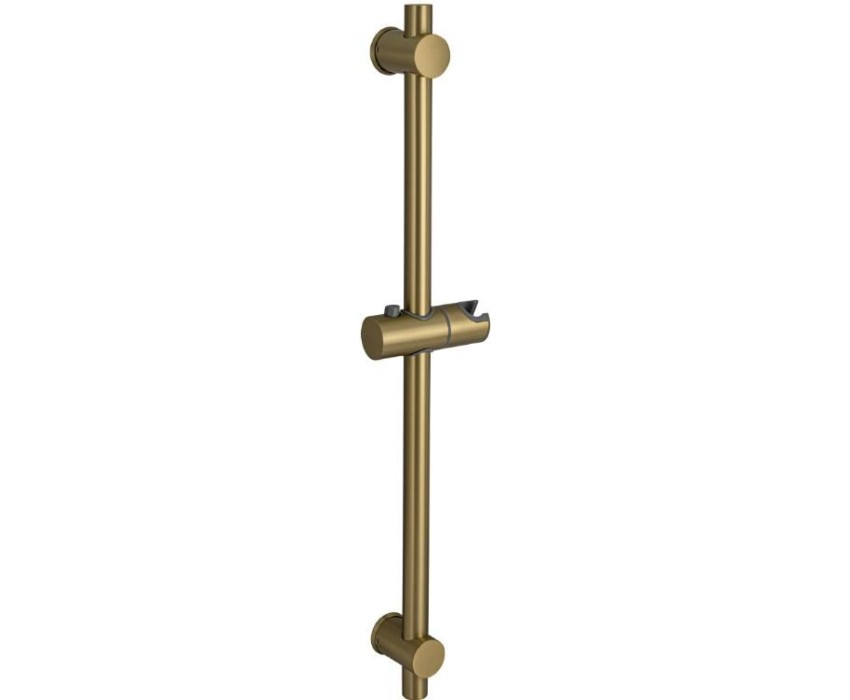 Душевая стойка, матовая, под золото, произведена из нержавеющей стали марки 304, устойчивой к агрессивному воздействию внешней среды и механическим деформациям, держатель для душа с кнопочной фиксацией и регулировкой по высоте. Размеры: высота штанги 650 мм, глубина 67 мм, диаметр трубы 25 мм, диаметр крепления 43 мм. Вес - 0,66 кг, объём - 0,0055 м3. В комплекте душевая штанга, крепления, держатель душевой лейки.