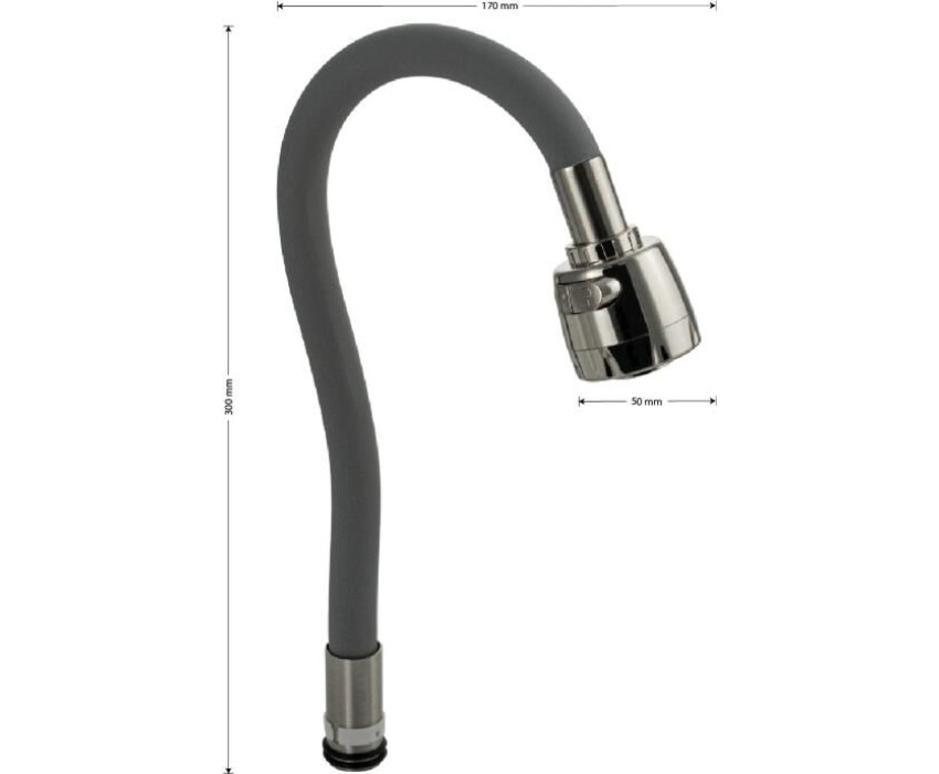 Излив к смесителю на кухню, гибкий с большим двухрежимным аэратором. Основным предназначением излива является подача воды, поступающей из смесителя. С-образная деталь имеет удобную конфигурацию и отлично подходит к смесителям на раковину и мойкам. Длинный излив обеспечит мощный поток воды. Универсальный излив для смесителя изготовлен из нержавеющей стали с силиконовой оболочкой серого цвета. За счет гибкости излива, Вы без труда сможете вымыть объемную посуду, фрукты, дотянуться до труднодоступных мест и любого содержимого мойки Идеально впишется в любой дизайн и может использоваться повсеместно. Устройство оснащено аэратором, проходя через него, вода насыщается множеством пузырьков воздуха, позволяя формировать струю в мягкий и ровный поток, а также экономить расход воды. Габаритные размеры: глубина 170 мм, высота 300 мм. Вес - 0,53 кг, объём - 0,00341 м3.