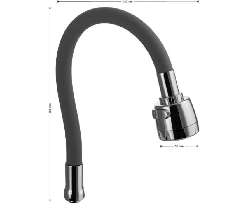 Излив к смесителю на кухню, гибкий с большим двухрежимным аэратором. Основным предназначением излива является подача воды, поступающей из смесителя. С-образная деталь имеет удобную конфигурацию и отлично подходит к смесителям на раковину и мойкам. Длинный излив обеспечит мощный поток воды. Универсальный излив для смесителя изготовлен из нержавеющей стали с силиконовой оболочкой серого цвета. За счет гибкости излива, Вы без труда сможете вымыть объемную посуду, фрукты, дотянуться до труднодоступных мест и любого содержимого мойки Идеально впишется в любой дизайн и может использоваться повсеместно. Устройство оснащено аэратором, проходя через него, вода насыщается множеством пузырьков воздуха, позволяя формировать струю в мягкий и ровный поток, а также экономить расход воды. Габаритные размеры: глубина 170 мм, высота 300 мм. Вес - 0,55 кг, объём - 0,00341 м3.