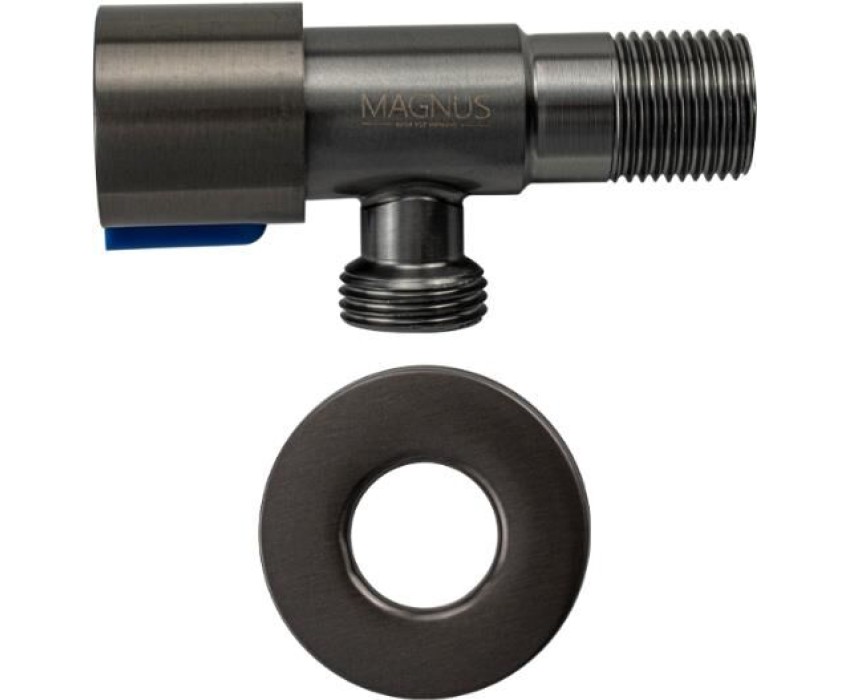 МАГНУС - Кран металлокерамика угловой 1/2"х1/2", синяя ручка, с отражателем, из нержавеющей стали марки SUS 304, цвет ГРАФИТ. 9269-GR