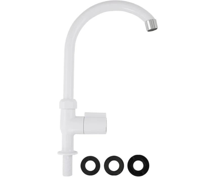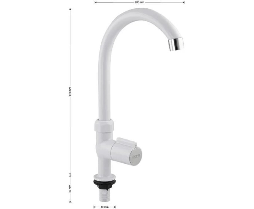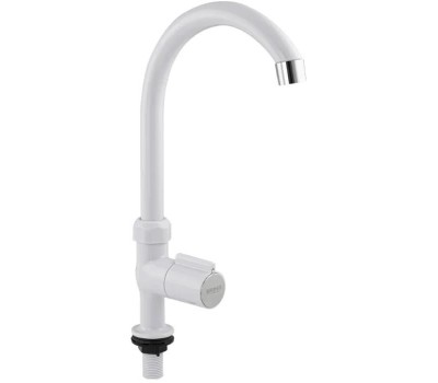Кран на одну воду, из высокопрочного пластика АБС, белый, с хромированным аэратором для экономии воды, с высоким изливом. Крепление резьба - гайка. Кранбукса м/к, белая круглая ручка с хромированной вставкой, поворот на 90˚. Габаритные размеры: высота 310 мм, длина 200 мм, диаметр посадочного седла 40 мм, длина резьбы 45 мм. Вес - 0,38 кг, объём - 0,00447 м3. В комплекте корпус, паспорт, крепёж.