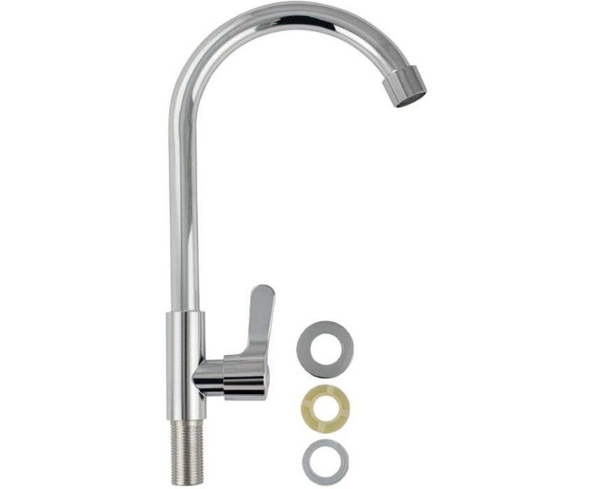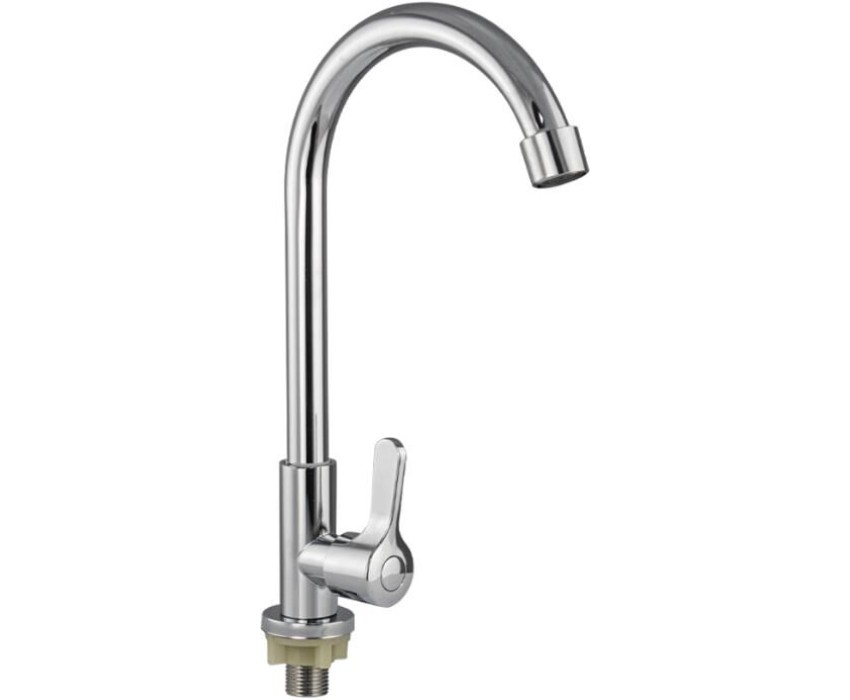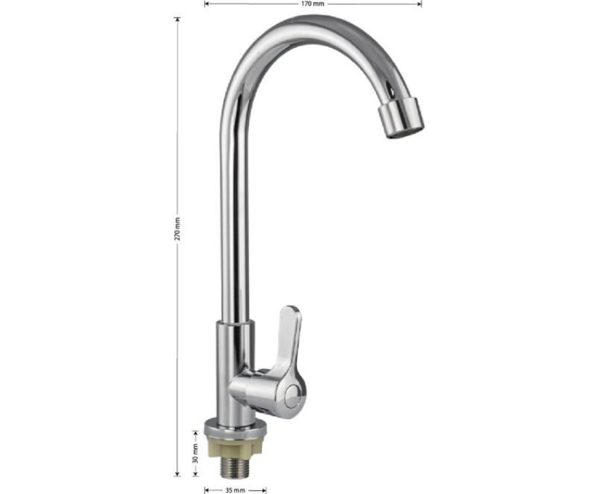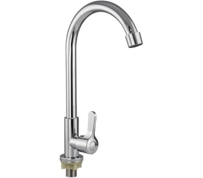 Кран на одну воду для кухонной мойки и раковин, хромированный корпус, из полированной нержавеющей стали марки SUS 304, с высоким С - образным изливом, с аэратором для экономии воды. Крепление резьба - гайка, подключение к водопроводной сети с помощью гибких шлангов с накидной гайкой на 1/2. Кранбукса м/к, ручка шток, поворот на 90˚. Такая модель может использоваться на домашней кухне, на даче, в медицинских учреждениях и общественных местах. Габаритные размеры: высота 270 мм, длина 170 мм, диаметр посадочного седла 35 мм, длина резьбы 30 мм. Вес - 0,4 кг, объём - 0,000106 м3. В комплекте корпус с изливом, крепёж.