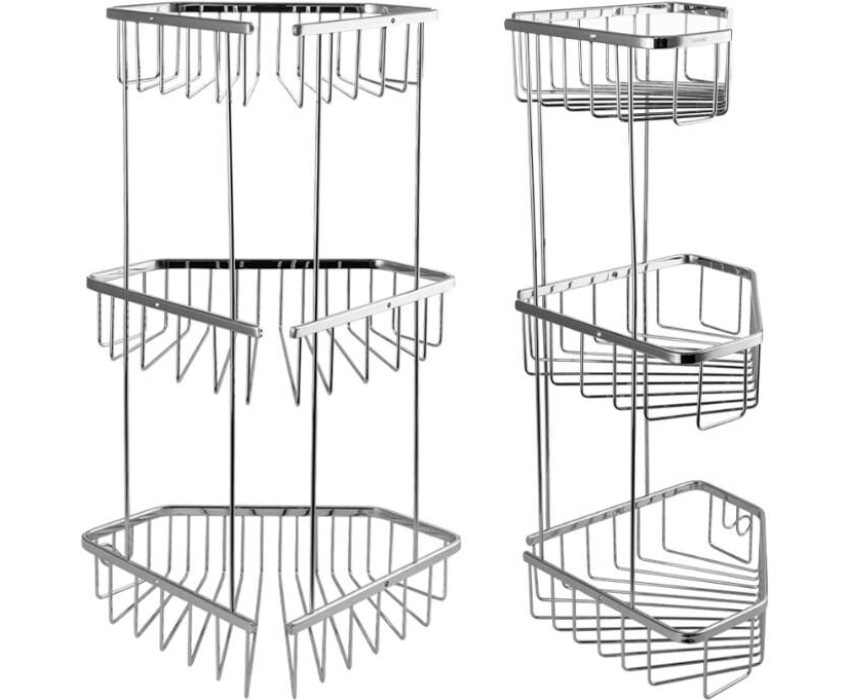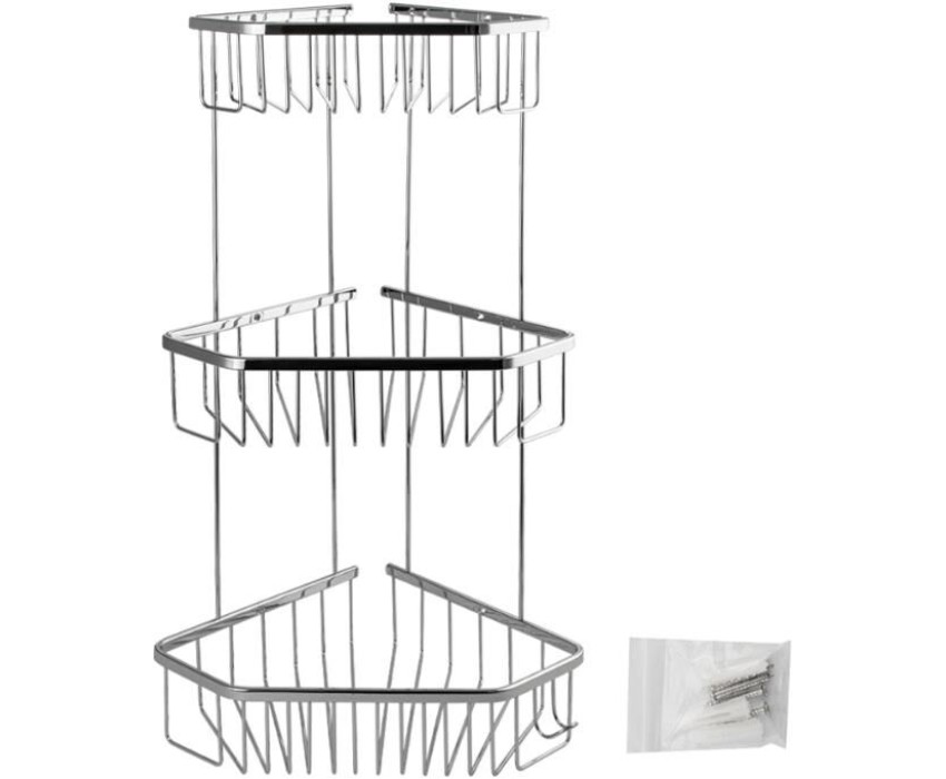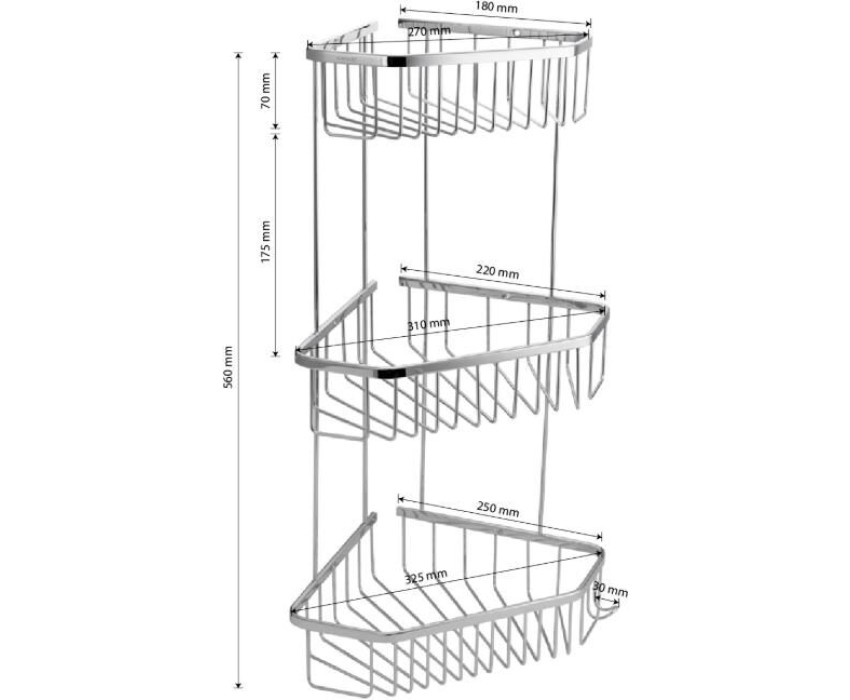 Полочка угловая, пятиугольная, двухэтажная, для принадлежностей, решётка обладает высокими эксплуатационными характеристиками и подходит для использования дома, в общественных местах: отелях, ресторанах и пр. Изготовлена из прочной нержавеющей стали с хромоникелевым покрытием, которое придает безупречный глянцевый блеск и долговечность. Металлическая полка оснащена крючкоми. Аксессуар не занимает много места, надежно фиксируется к стене при помощи набора креплений (входят в комплект) и служит удобным местом для хранения бытовых и косметических средств. Габаритные размеры: высота 560 мм, верхняя полка 180*270 мм, средняя полка 220*310 мм, нижняя полка 250*325 мм, расстояние между полками 175 мм, высота полки 70 мм. Вес - 1,600 кг, объём - 0,04500 м3.
