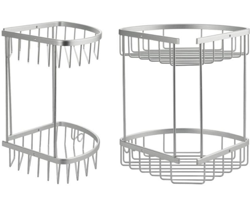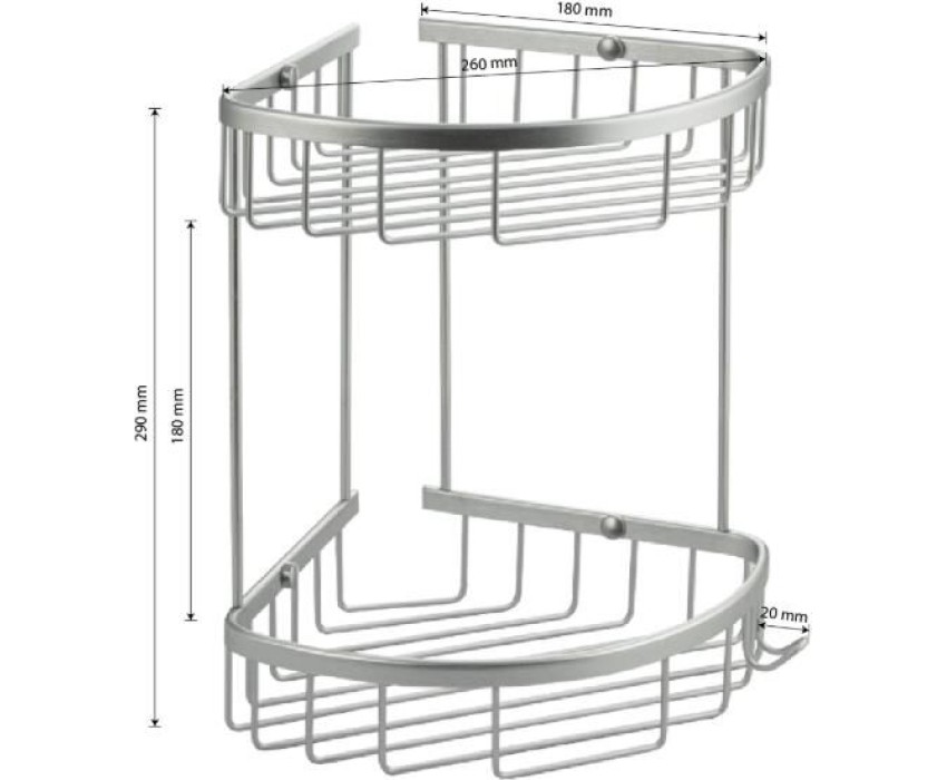 Полочка для принадлежностей угловая, решётка, двухэтажная, с крючком, обладает высокими эксплуатационными характеристиками и подходит для использования дома, в общественных местах: отелях, ресторанах и пр. Изготовлена из прочного алюминия с матовым покрытием, которое придает безупречный вид и долговечность. Аксессуар не занимает много места, надежно фиксируется к стене при помощи набора креплений (входят в комплект) и служит удобным местом для хранения бытовых и косметических средств. Габаритные размеры: длина 180 мм, ширина 260 мм, высота 290 мм, расстояние между полками 180 мм. Вес - 0,400 кг, объём - 0,00815 м3