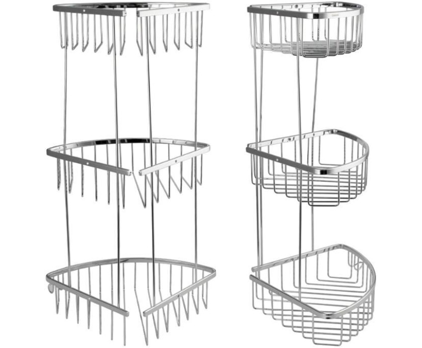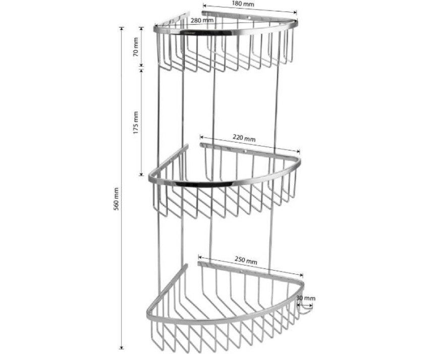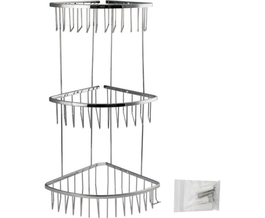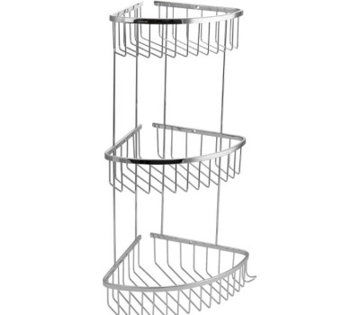 Полочка угловая, овальная, трёхэтажная, для принадлежностей, решётка обладает высокими эксплуатационными характеристиками и подходит для использования дома, в общественных местах: отелях, ресторанах и пр. Изготовлена из прочной нержавеющей стали с хромоникелевым покрытием, которое придает безупречный глянцевый блеск и долговечность. Металлическая полка оснащена крючком. Аксессуар не занимает много места, надежно фиксируется к стене при помощи набора креплений (входят в комплект) и служит удобным местом для хранения бытовых и косметических средств. Габаритные размеры: высота 560 мм, глубина верхней полки 180 мм, глубина средней полки 220 мм, глубина нижней полки 250 мм, расстояние между полками 175 мм. Вес - 1,700 кг, объём - 0,04500 м3.