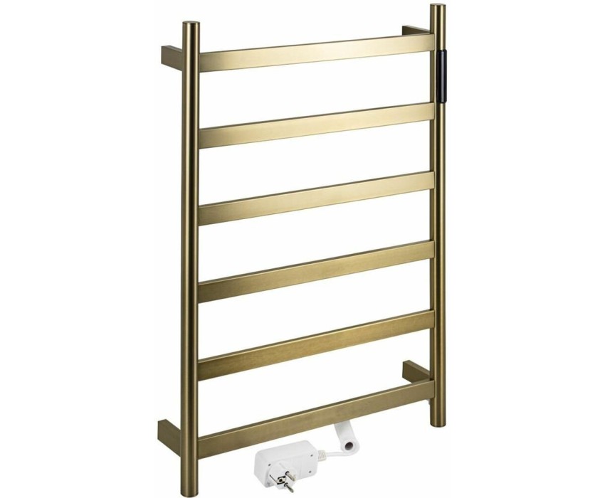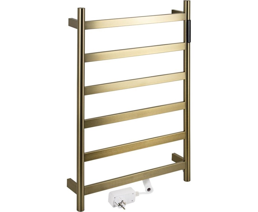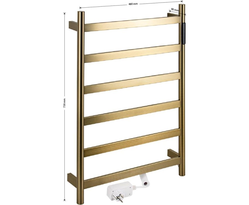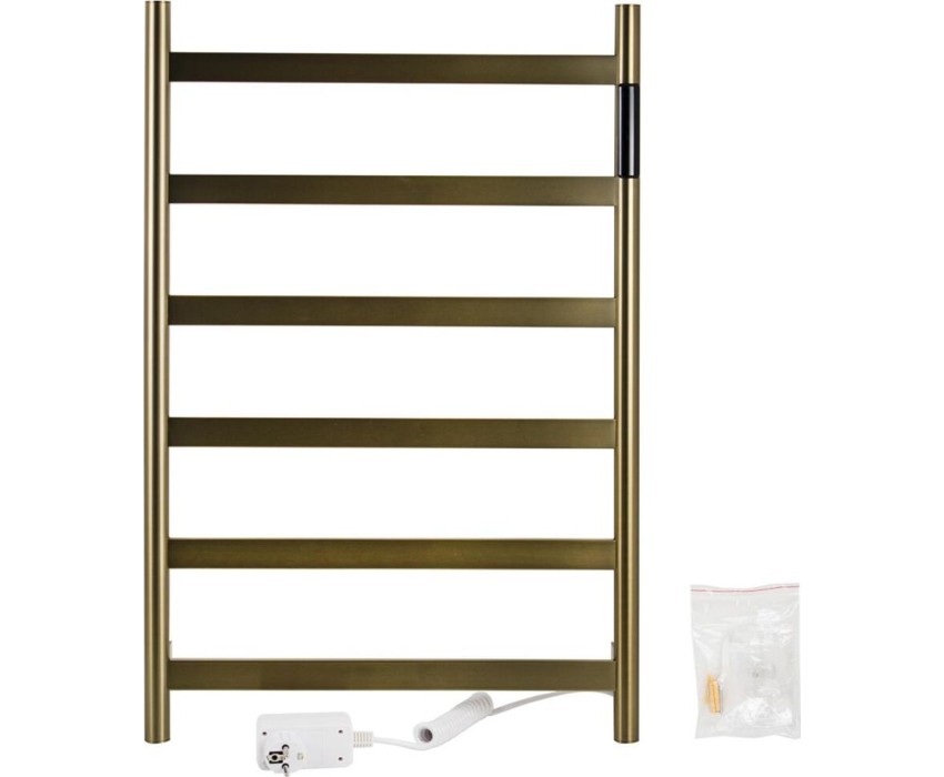 Полотенцесушитель электрический под бронзу матовый, лесенка из нержавеющей стали марки 304, с таймером до 24 часов, регулировка температуры от 35°С до 70°С, тэн из углеродного волокна, гармонично впишется в современный интерьер и поможет поддержать комфортную атмосферу в ванной комнате, работает вне зависимости от отопительного сезона, и его можно разместить в любом месте ванной или даже на стене в комнате. Матовая поверхность устойчива к высоким температурам. Благодаря продуманному расположению труб можно размещать объемный текстиль, сократив время просушки. Установка и ремонт не требуют работы сантехников. Габариты и параметры: ширина 480 мм, высота 730 мм, глубина 90 мм. 6 перекладин, с сухим ТЭНом, 75 W, 220-230 V, 50-60 Гц, t - 55°С, IP 44. Комплект: полотенцесушитель, крепёж, провод с евровилкой для подключения. Вес - 4,0 кг, объём - 0,06 м3