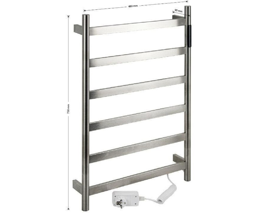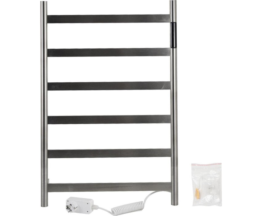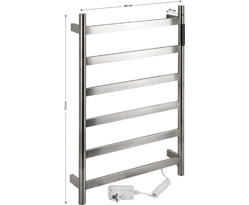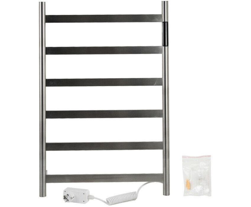 Полотенцесушитель электрический хром матовый, лесенка из нержавеющей стали марки 304, с таймером до 24 часов, регулировка температуры от 35°С до 70°С, тэн из углеродного волокна, гармонично впишется в современный интерьер и поможет поддержать комфортную атмосферу в ванной комнате, работает вне зависимости от отопительного сезона, и его можно разместить в любом месте ванной или даже на стене в комнате. Матовая поверхность устойчива к высоким температурам. Благодаря продуманному расположению труб можно размещать объемный текстиль, сократив время просушки. Установка и ремонт не требуют работы сантехников. Габариты и параметры: ширина 480 мм, высота 730 мм, глубина 90 мм. 6 перекладин, с сухим ТЭНом, 75 W, 220-230 V, 50-60 Гц, t - 55°С, IP 44. Комплект: полотенцесушитель, крепёж, провод с евровилкой для подключения. Вес - 4,0 кг, объём - 0,06 м3