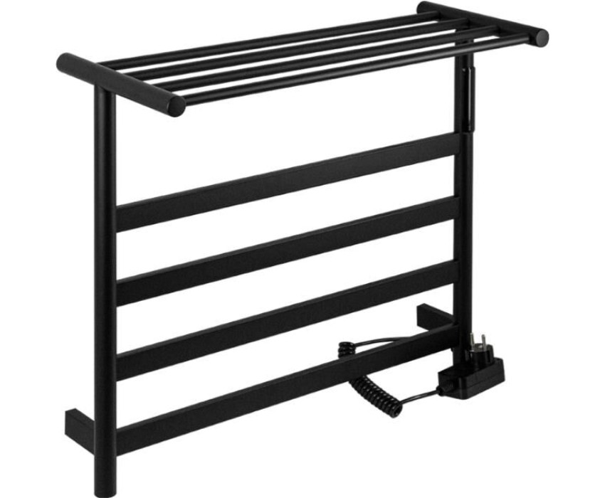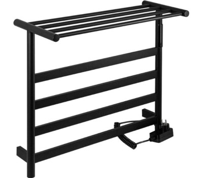 Полотенцесушитель электрический цвет чёрный, лесенка с полкой, из нержавеющей стали, сенсорное управление с таймером до 24 часов, регулировка температуры от 40 до 60 градусов, тэн из углеродного волокна гармонично впишется в современный интерьер и поможет поддержать комфортную атмосферу в ванной комнате, работает вне зависимости от отопительного сезона, и его можно разместить в любом месте ванной или даже на стене в комнате. Сверху нанесено полимерное чёрное покрытие, устойчивое к высоким температурам. Благодаря продуманному расположению труб можно размещать объемный текстиль, сократив время просушки. Установка и ремонт не требуют работы сантехников.Запуск - нажатием одной кнопки. Габариты и параметры: 510 х 575 х 220 мм, на 4 перекладины с сухим ТЭНом, 75 Вт, 220-230 В, 50-60 Гц, t - 55*C, IP 44. Комплект: полотенцесушитель, крепёж, провод с евровилкой для подключения. Вес - 4,300 кг, объём - 0,05000 м3