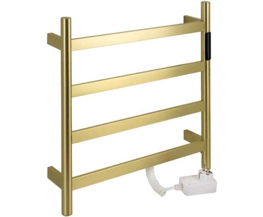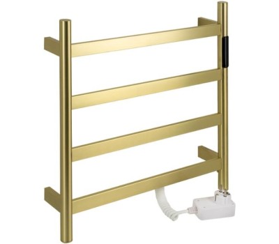 Полотенцесушитель электрический, цвет матовое золото, лесенка, из нержавеющей стали, сенсорное управление с таймером до 24 часов, регулировка температуры от 40°С до 60°С, тэн из углеродного волокна гармонично впишется в современный интерьер и поможет поддержать комфортную атмосферу в ванной комнате, работает вне зависимости от отопительного сезона, и его можно разместить в любом месте ванной или даже на стене в комнате. ПВД покрытие цвет бронза, устойчивое к высоким температурам. Благодаря продуманному расположению труб можно размещать объемный текстиль, сократив время просушки. Установка и ремонт не требуют работы сантехников. Габаритные размеры: ширина 475 мм, высота 505 мм, глубина 90 мм. 4 перекладины. С сухим ТЭНом, 75 Вт, 220-230 В, 50-60 Гц, t 55°С, IP 44. Комплект: полотенцесушитель, крепёж, провод с евровилкой для подключения. Вес - 3,000 кг, объём - 0,04250 м3.