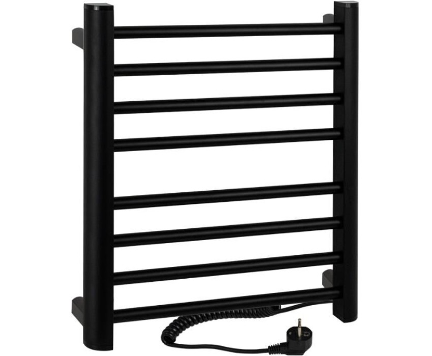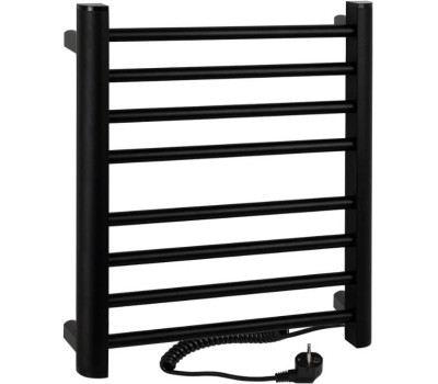 Полотенцесушитель электрический, чёрный, лесенка, из алюминия, тэн из углеродного волокна гармонично впишется в современный интерьер и поможет поддержать комфортную атмосферу в ванной комнате, работает вне зависимости от отопительного сезона, и его можно разместить в любом месте ванной или даже на стене в комнате. Сверху нанесено чёрное полимерное покрытие, устойчивое к высоким температурам. Благодаря продуманному расположению труб можно размещать объемный текстиль, сократив время просушки. Установка и ремонт не требуют работы сантехников. Габаритные размеры: высота 600 мм, ширина 500 мм, глубина 90 мм. 8 перекладин, с сухим ТЭНом, 90 W, 220-230 V, 50-60 Гц, t - 55°С, IP 44. Комплект: полотенцесушитель, крепёж, провод с евровилкой для подключения. Вес - 3,300 кг, объём - 0,02800 м3.