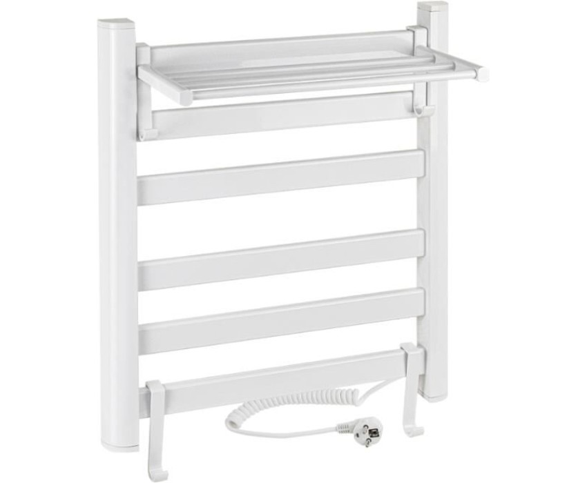 Полотенцесушитель электрический белый, лесенка с полкой и крючками, из алюминия, тэн из углеродного волокна гармонично впишется в современный интерьер и поможет поддержать комфортную атмосферу в ванной комнате, работает вне зависимости от отопительного сезона, и его можно разместить в любом месте ванной или даже на стене в комнате. Сверху нанесено белое полимерное покрытие, устойчивое к высоким температурам. Благодаря продуманному расположению труб можно размещать объемный текстиль, сократив время просушки. Установка и ремонт не требуют работы сантехников. Габаритные размеры: высота 600 мм, ширина 500 мм, полка 270 мм. 6 плоских перекладин, с сухим ТЭНом, 160 W, 220-230 V, 50-60 Гц, t - 55°С, IP 44. Комплект: полотенцесушитель, крепёж, провод с евровилкой для подключения. Вес - 4,500 кг, объём - 0,03800 м3.