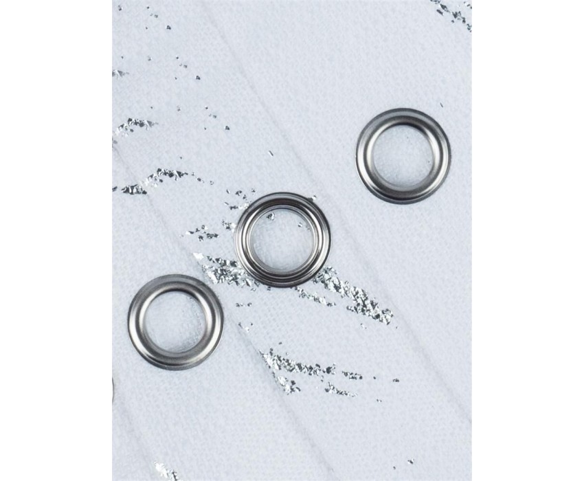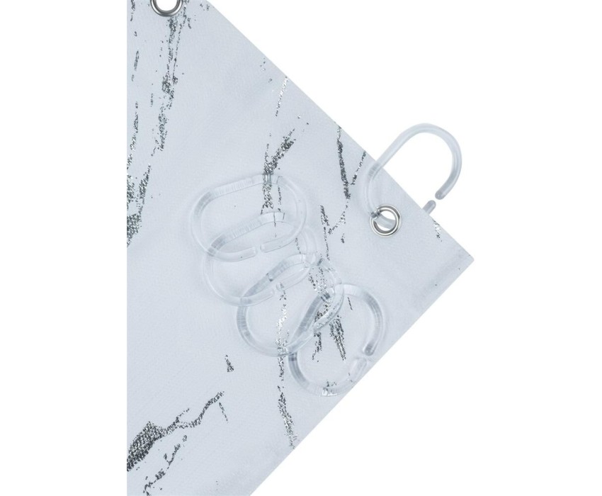 Штора для ванной комнаты Состав: полиэстер 125 г/м2, сталь, пластик Размер: 180х200 см С водоотталкивающими свойствами Фактура ткани под лён 12 стальных люверсов 12 прозрачных крючков в комплекте Цвет: белый, серебряный; узор