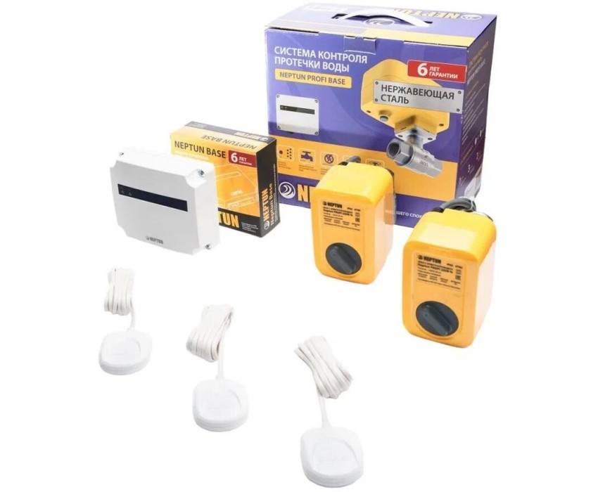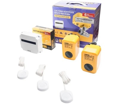 В состав входят российские краны из нержавеющей стали марки SS304 с электроприводом Neptun PROFI и российские компоненты (модуль и датчики). Состав комплекта: Модуль управления Neptun Base-1шт Датчик контроля протечки воды SW005-3 шт Кран шаровый с электроприводом серии NEPTUN PROFI 220В-2шт