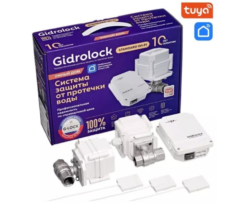 Комплект защиты от протечки воды стандарта Gidrоlock Standard Wi- Fi G-LocK предназначен для автоматического перекрытия подачи воды в квартире или загородном доме. Система обезопасит Вас от негативных последствий потопа при помощи высококачественных итальянских шаровых кранов G-LocKi и электроприводом Gidrolock. При попадании влаги на контакты проводного датчика WSP, блок управления проинформирует о возникшей аварии звуковым и световым сигналом и одновременно даст команду шаровым кранам перекрыть подачу воды в помещение. При этом на ваш смартфон приходит Push- уведомление о протечке. Возможно ручное и дистанционное управление при помощи приложения Smart life умного дома TUYA. Для обнаружения возможных мест протечки количество установленных датчиков можно увеличить до 200 штук. Работает с приложением Алиса от Яндекса.