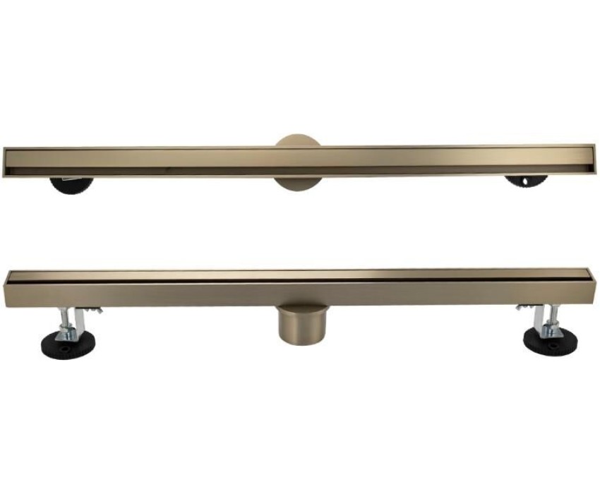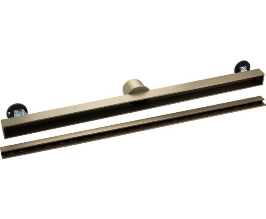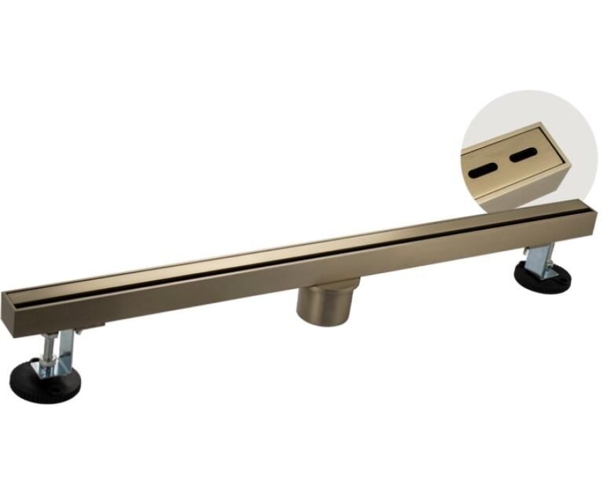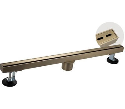 Душевой сливной трап из нержавеющей стали, линейный, вертикальный с сухим затвором, крышка двухсторонняя щелевая или с отверстиями по всей длине, цвет матовое золото. Это специальный элемент сантехнических коммуникаций, предназначенный для отвода воды в систему канализации. Как правило, душевые трапы устанавливаются непосредственно в пол. Благодаря небольшим габаритам и высоте душевые трапы идеальны для установки в душевых зонах. Это важно для организации пространства, где нет возможности установить классическую ванну: в малогабаритных квартирах, студиях, совмещенных санузлах и т.п. Габаритные размеры: ширина 32 мм, длина 600 мм, высота до 100 мм, выход в канализацию 50 мм. Вес - 2,4 кг, объём - 0,006 м3.