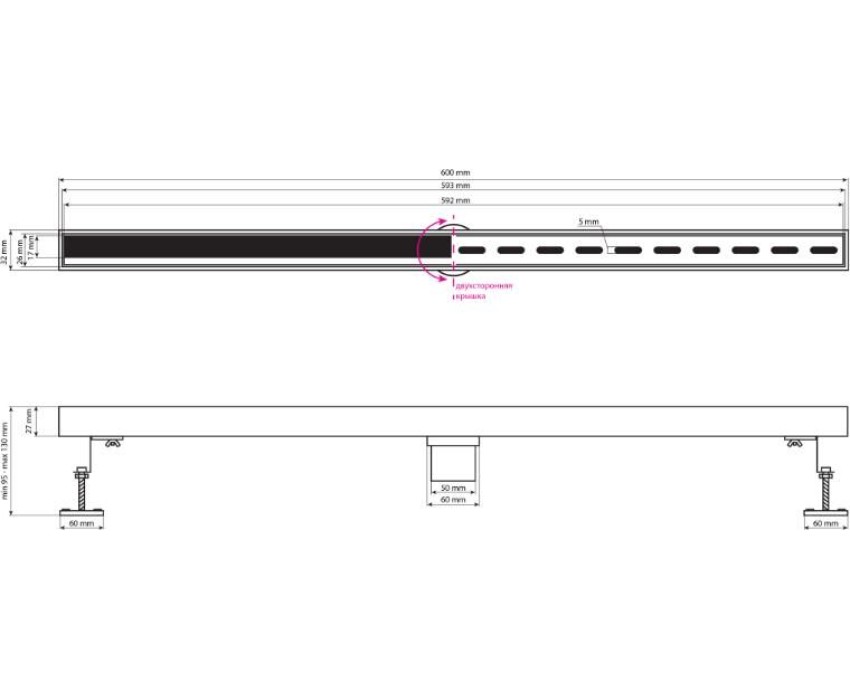 САНАКС - Трап 600х32 мм, нержавеющая сталь, линейный, вертикальный, щелевой, с сухим затвором, двухсторонняя решетка , цвет МАТОВОЕ ЗОЛОТО. 40063