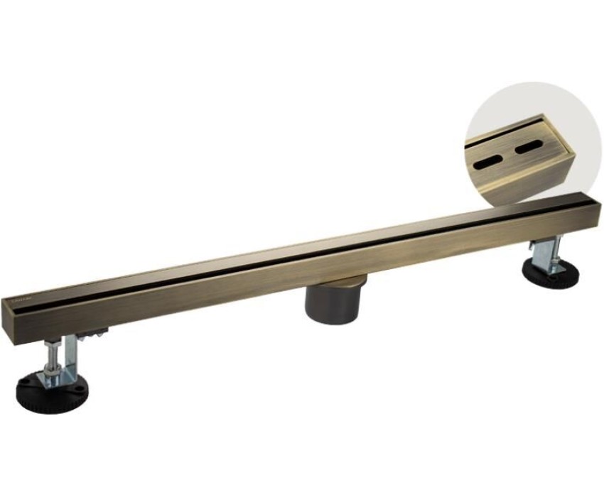 Душевой сливной трап из нержавеющей стали, линейный, вертикальный с сухим затвором, крышка двухсторонняя щелевая или с отверстиями по всей длине, цвет бронза. Это специальный элемент сантехнических коммуникаций, предназначенный для отвода воды в систему канализации. Как правило, душевые трапы устанавливаются непосредственно в пол. Благодаря небольшим габаритам и высоте душевые трапы идеальны для установки в душевых зонах. Это важно для организации пространства, где нет возможности установить классическую ванну: в малогабаритных квартирах, студиях, совмещенных санузлах и т.п. Габаритные размеры: ширина 32 мм, длина 600 мм, высота до 100 мм, выход в канализацию 50 мм. Вес - 2,4 кг, объём - 0,006 м3.