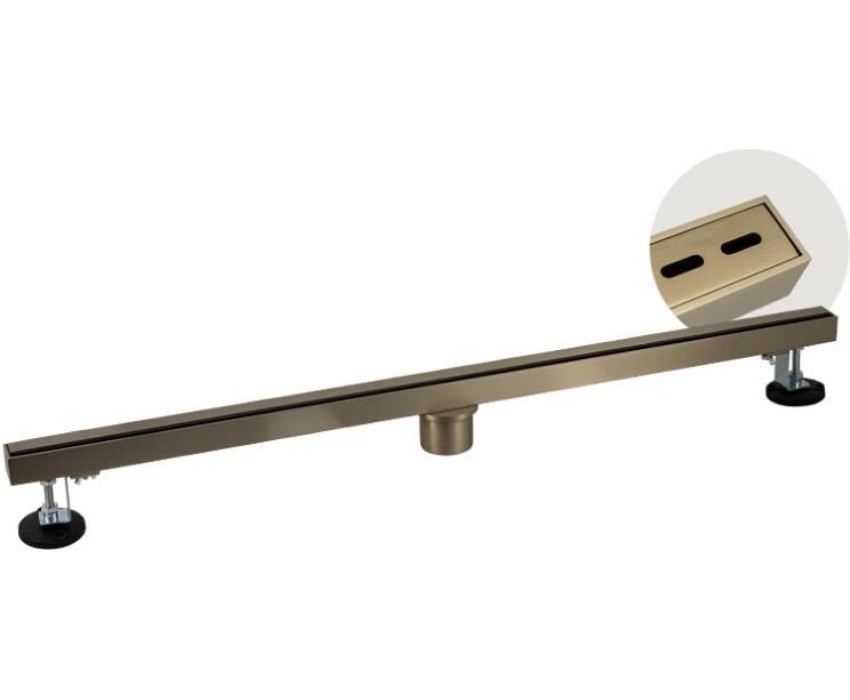 Душевой сливной трап из нержавеющей стали, линейный, вертикальный с сухим затвором,крышка двухсторонняя щелевая или с отверстиями по всей длине, цвет матовое золото. Это специальный элемент сантехнических коммуникаций, предназначенный для отвода воды в систему канализации. Как правило, душевые трапы устанавливаются непосредственно в пол. Благодаря небольшим габаритам и высоте душевые трапы идеальны для установки в душевых зонах. Это важно для организации пространства, где нет возможности установить классическую ванну: в малогабаритных квартирах, студиях, совмещенных санузлах и т.п. Габаритные размеры: ширина 32 мм, длина 800 мм, высота до 100 мм, выход в канализацию 50 мм. Вес - 3,1 кг, объём - 0,007 м3.