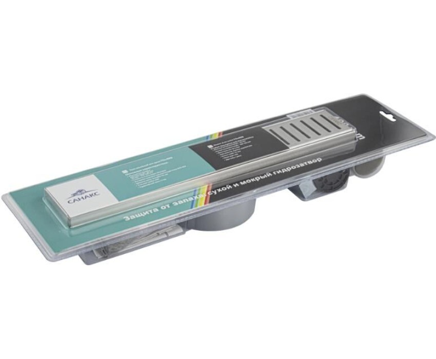 САНАКС - Трап 400 х 70 мм, с бортиком для плитки, из нержавеющей стали, горизонтальное подключение 360º, с сухим и гидрозатворами, цвет САТИН. 00037
