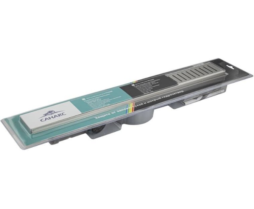 САНАКС - Трап 600 х 70 мм, с бортиком для плитки, из нержавеющей стали, горизонтальное подключение 360º, с сухим и гидрозатворами, цвет САТИН. 00039