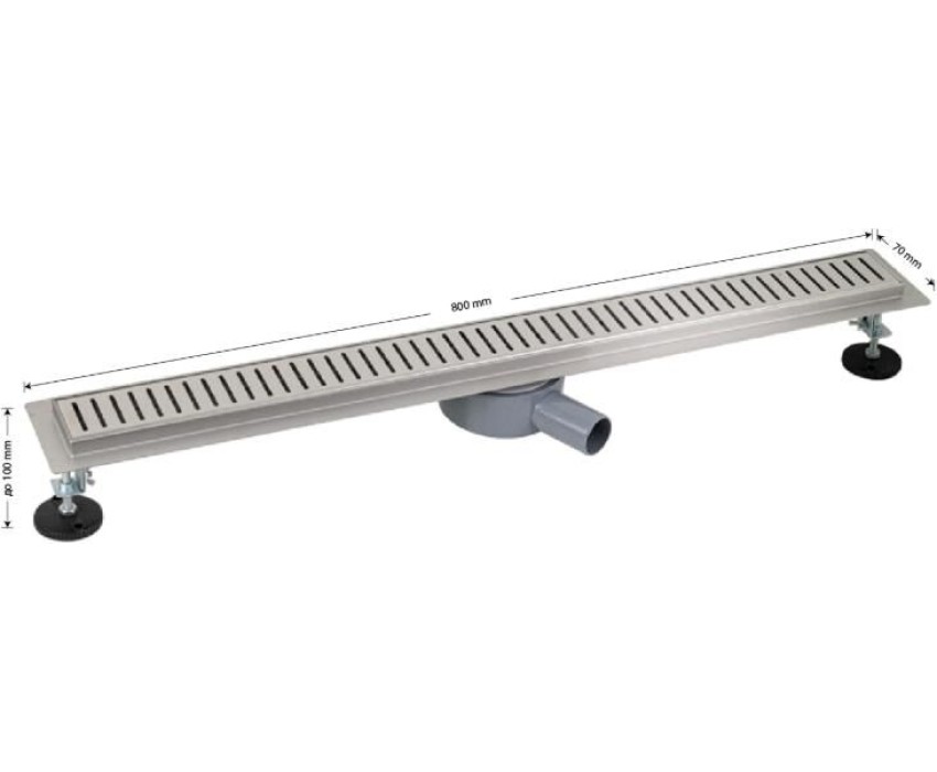 Душевой сливной трап из нержавеющей стали, линейный, горизонтальный, с гидрозатвором , с регулируемыми ножками и бортиком под плитку шириной 20 мм с четырёх сторон – это специальный элемент сантехнических коммуникаций, предназначенный для отвода воды в систему канализации. Как правило, душевые трапы устанавливаются непосредственно в пол. Благодаря небольшим габаритам и высоте душевые трапы идеальны для установки в душевых зонах. Это важно для организации пространства, где нет возможности установить классическую ванну: в малогабаритных квартирах, студиях, совмещенных санузлах и т.п. Габаритные размеры: высота до 100 мм, ширина 70 мм, длина 800 мм, выход в канализацию 50 мм. В комлекте идут регулируемые ножки высотой до 10 мм от пола, вращающийся слив на 360°. Вес - 3,200 кг, объём - 0,01227 м3