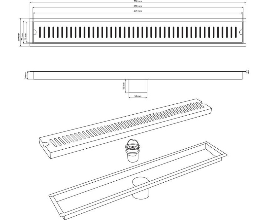 Душевой сливной трап из нержавеющей стали, линейный, вертикальный с гидрозатвором – это специальный элемент сантехнических коммуникаций, предназначенный для отвода воды в систему канализации. Как правило, душевые трапы устанавливаются непосредственно в пол. Благодаря небольшим габаритам и высоте душевые трапы идеальны для установки в душевых зонах. Это важно для организации пространства, где нет возможности установить классическую ванну: в малогабаритных квартирах, студиях, совмещенных санузлах и т.п. Габаритные размеры: высота 70 мм, ширина 100 мм, длина 700 мм, выход в канализацию 50 мм. Вес - 1.3 кг, объём - 0.00624 м3.