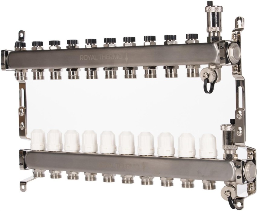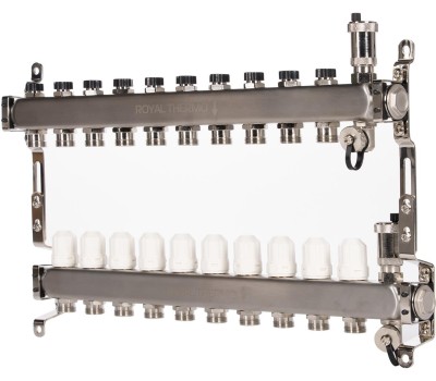 Сантехническая арматура ROYAL THERMO Коллектор нерж. в сборе универсальный 1" ВР-3/4" НР с автомат. воздухоотвод-ми 10 вых