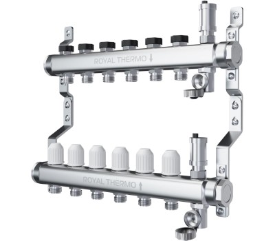 Сантехническая арматура ROYAL THERMO Коллектор нерж. в сборе универсальный 1" ВР-3/4" НР с автомат. воздухоотвод-ми 11 вых