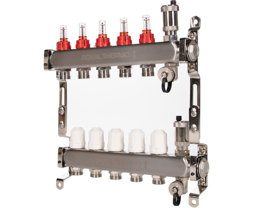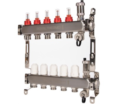 Сантехническая арматура ROYAL THERMO Коллектор нерж. в сборе с расходомерами 1" ВР-3/4" НР с автомат. воздухоотвод-ми 5 вых