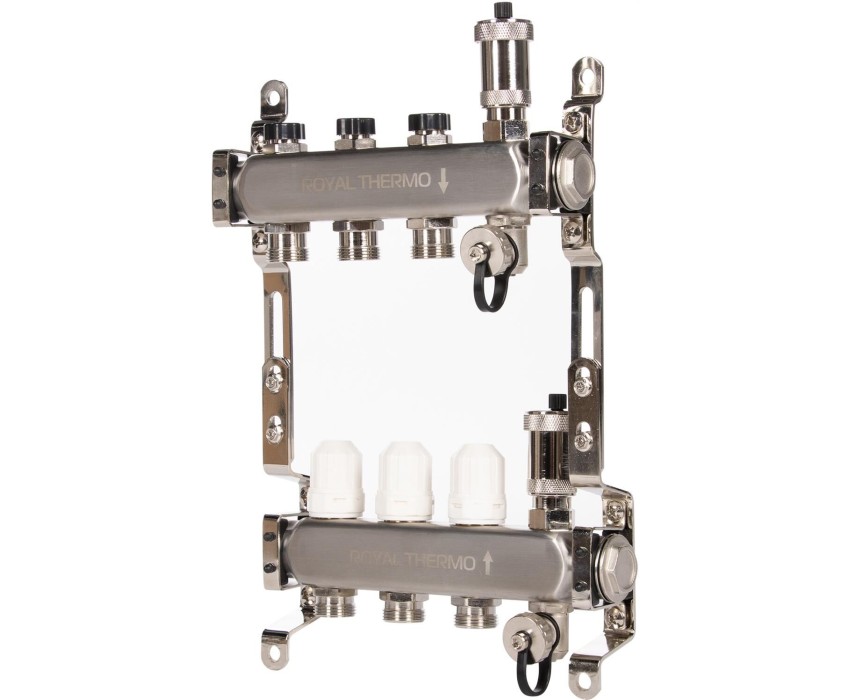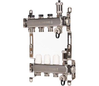 Сантехническая арматура ROYAL THERMO Коллектор нерж. в сборе универсальный 1" ВР-3/4" НР с автомат. воздухоотвод-ми 3 вых