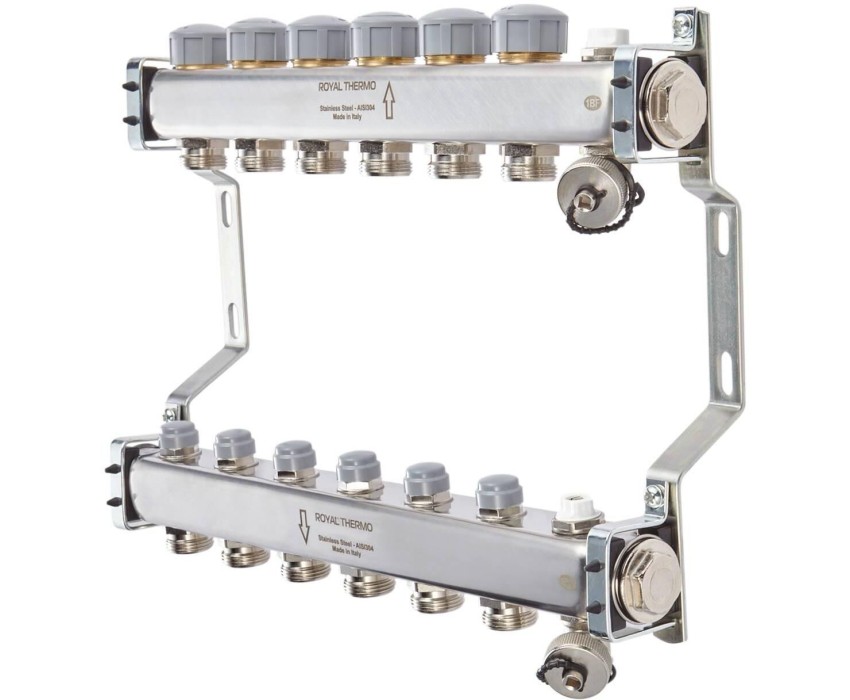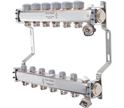 Сантехническая арматура ROYAL THERMO Коллектор нерж. в сборе универсальный 1" ВР-3/4" НР, 6 выходов