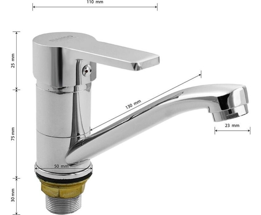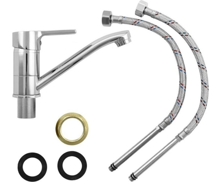 Смеситель для кухонной мойки и раковины, хромированный, с коротким, поворотным изливом, шаровый, литая ручка. Материал изготовления — ЦАМ (цинк-алюминий-медь). Крепление резьба - гайка, картридж d = 40 мм, литая ручка. Аэратор для экономии воды. Габаритные размеры: высота 100 мм, длина 170 мм, длина излива150 мм, диаметр посадочного седла 50 мм, длина резьбы 30 мм, длина подводки 400 мм. Вес - 1,000 кг, объём - 0,00231 м3. В комплекте паспорт, корпус, подводка 1/2, крепеж, набор прокладок.