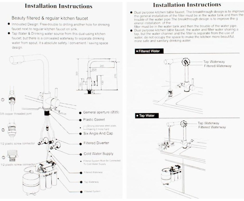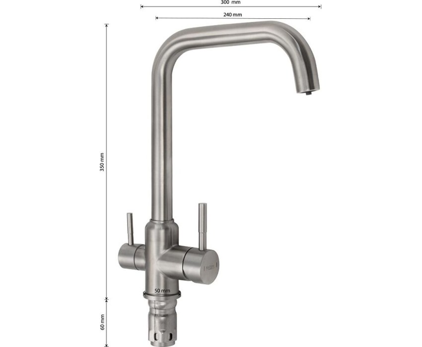 Смеситель для кухонной мойки и раковин, с двойным выпуском воды для фильтра, литой матовый корпус, из нержавеющей стали марки 304, с высоким Г-образным изливом, шаровый. Крепление резьба - гайка, картридж d = 40 мм, ручка шток. Аэратор для экономии воды. Такая модель может использоваться на домашней кухне, на даче, в медицинских учреждениях и общественных местах. Габаритные размеры: высота 350 мм, длина 300 мм, длина излива 240 мм, диаметр посадочного седла 50 мм, длина резьбы 60 мм, длина подводки 450 мм. Вес - 2,200 кг, объём - 0,00613 м3. В комплекте паспорт, корпус с изливом, подводка 1/2, крепеж, набор прокладок.
