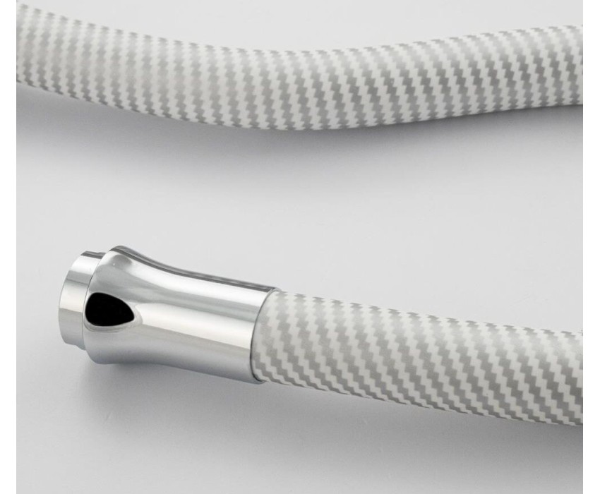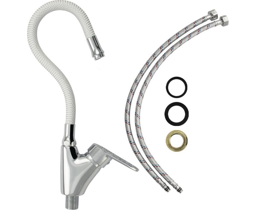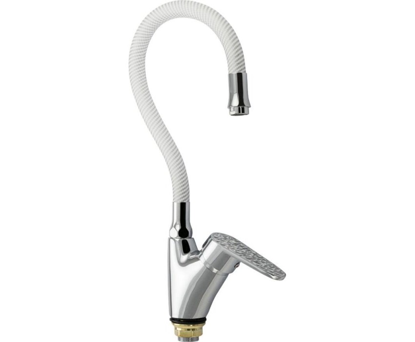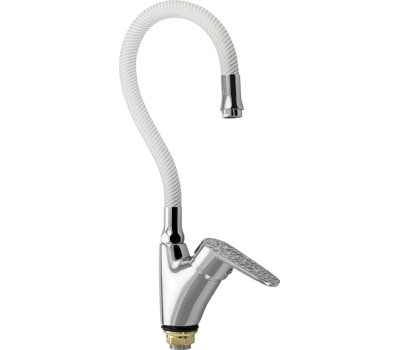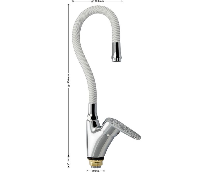 Смеситель для кухонной мойки и раковин, хромированный , боковой, с высоким гибким изливом белого цвета, полосатый, с аэратором для экономии воды, шаровый, Крепление резьба - гайка, картридж d = 40 мм, ручка с белой мозаикой , Аэратор для экономии воды. Габаритные размеры: высота до 400 мм, длина до 300 мм, диаметр посадочного седла 50 мм, длина резьбы 30 мм, длина подводки 500 мм. вес - кг, объём - м3. В комплекте паспорт, корпус с изливом, подводка 1/2, крепеж, набор прокладок