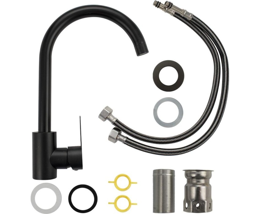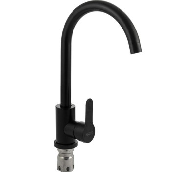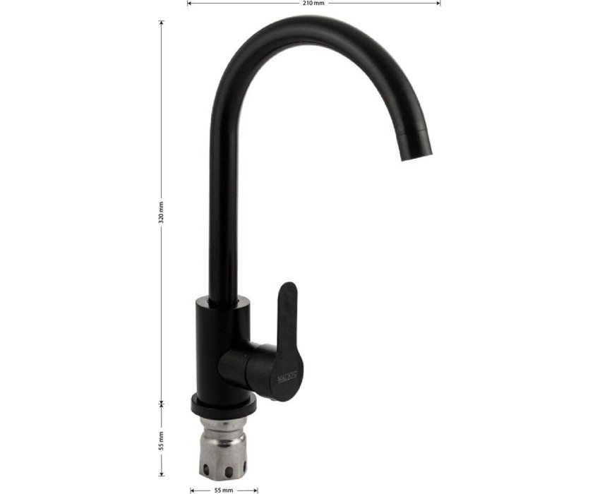 Смеситель для кухонной мойки и раковин, литой матовый корпус чёрного цвета, из нержавеющей стали марка 304, с высоким С-образным изливом, шаровый. Крепление резьба - гайка, картридж d = 35 мм, ручка литая. Аэратор для экономии воды. Такая модель может использоваться на домашней кухне, на даче, в медицинских учреждениях и общественных местах. Габаритные размеры: высота 320 мм, длина 210 мм, диаметр посадочного седла 55 мм, длина резьбы 55 мм, длина подводки 450 мм. Вес - 1,4 кг, объём - 0,00490 м3. В комплекте паспорт, корпус с изливом, подводка 1/2, крепеж, набор прокладок