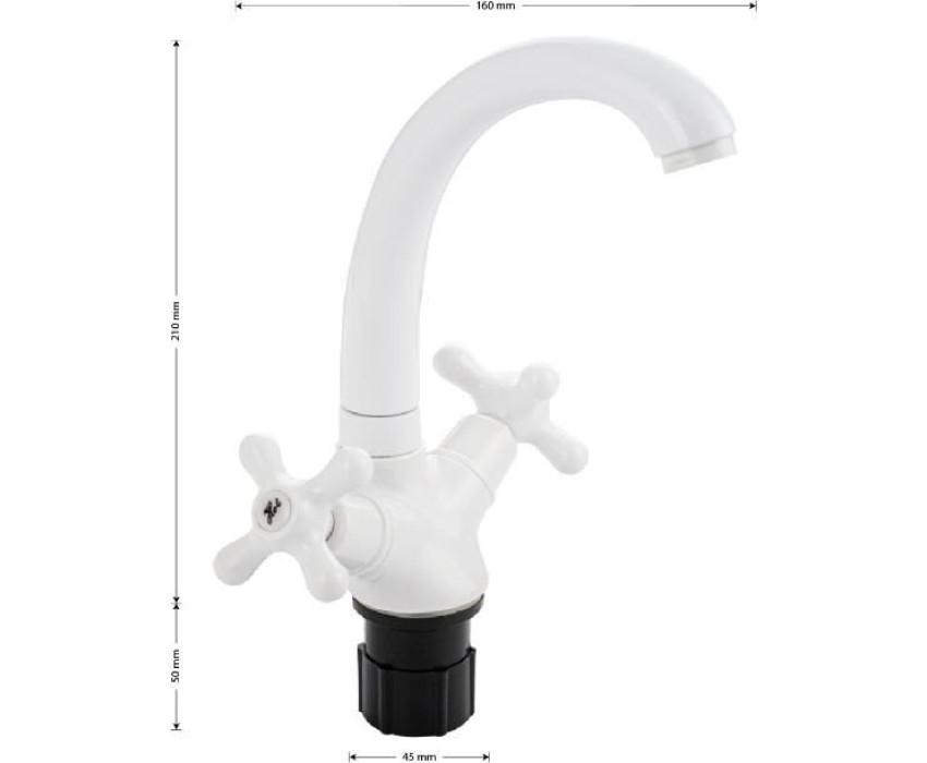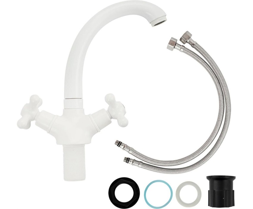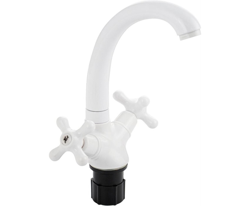 Смеситель из высокопрочного пластика АБС - белый, для кухонной мойки и раковин, с аэратором для экономии воды. Материал изготовления — пластик. Кранбуксы металлокерамика 1/2, ручки крест поворот на 90˚, крепление резьба - гайка. Габаритные размеры: высота 210 мм, длина 160 мм, диаметр посадочного седла 45 мм, длина резьбы 50 мм, длина подводки 450 мм. Вес - 0,6 кг, объём - 0,0025 м3. В комплекте корпус с изливом, паспорт, подводка, крепёж.