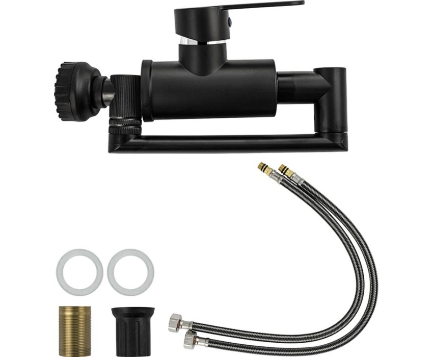 Смеситель для кухонной мойки и раковины, черный, с поворотным изливом и аэратором, шаровый.Из высокопрочного пластика АБС. Крепление резьба - гайка, картридж d = 40 мм. Аэратор для экономии воды. Габаритные размеры: высота 340 мм, длина 210 мм, диаметр посадочного седла 50 мм, длина резьбы 50 мм, длина подводки 500 мм. Вес - 0,84 кг, объём - 0,003 м3. В комплекте паспорт, корпус, подводка 1/2, крепеж, набор прокладок.