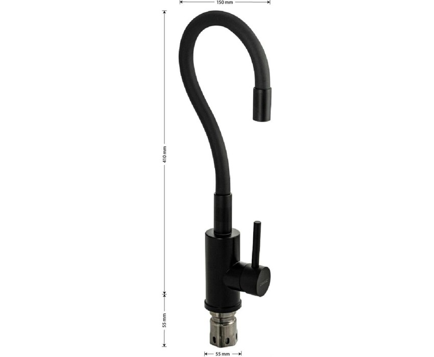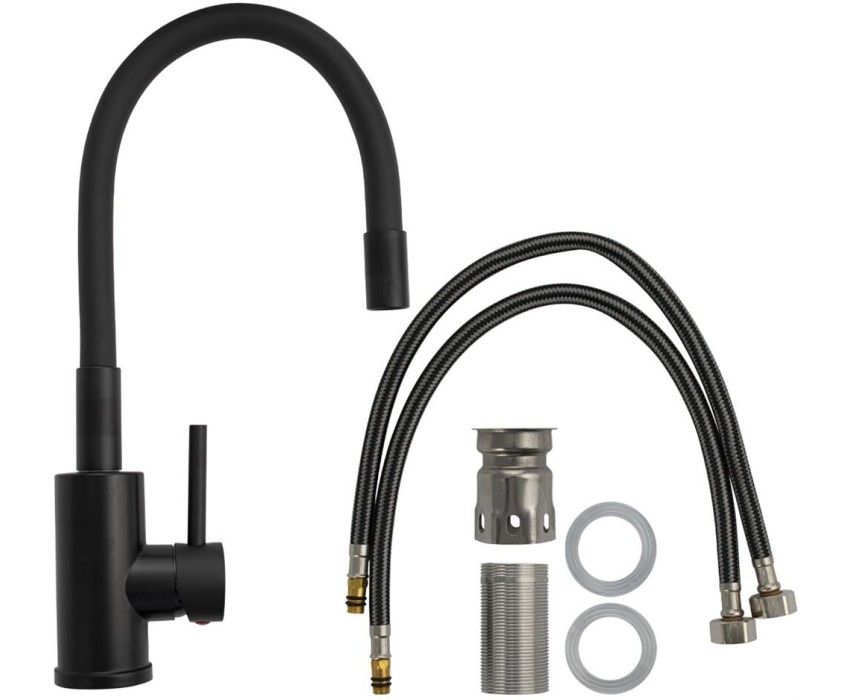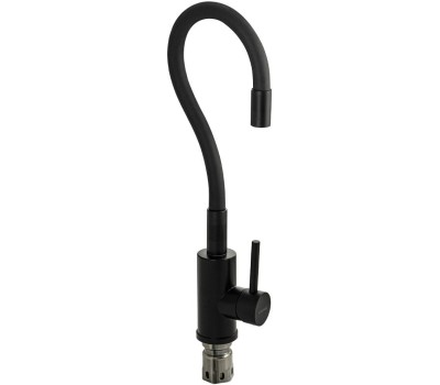 Смеситель для кухонной мойки и раковин, литой черный матовый корпус, из нержавеющей стали марки 304, с высоким гибким изливом, чёрного цвета, с аэратором для экономии воды, шаровый. Крепление резьба - гайка, картридж d = мм, ручка литая. Такая модель может использоваться на домашней кухне, на даче, в медицинских учреждениях и общественных местах. Габаритные размеры: высота до 410 мм, длина до 200 мм, диаметр посадочного седла 55 мм, длина резьбы 55 мм, длина подводки 500 мм. Вес - 1.27 кг, объём - 0.00385 м3. В комплекте паспорт, корпус с изливом, подводка 1/2, крепеж, набор прокладок.