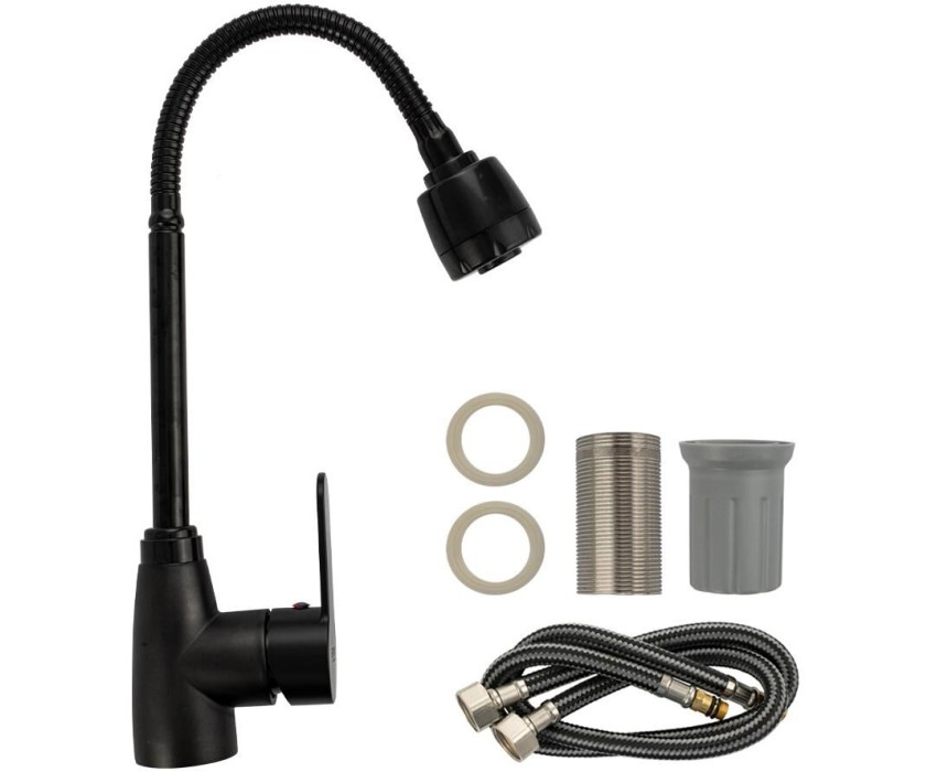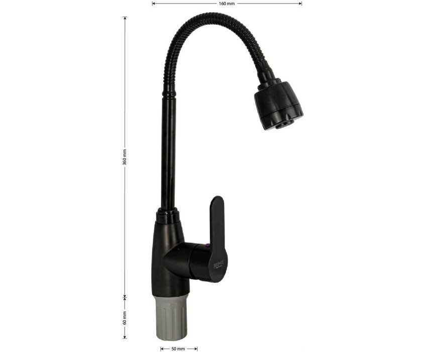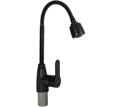 Смеситель для кухонной мойки и раковин, из высокопрочного пластика АБС, черный, боковой, с гибким изливом,с большим двухрежимным аэратором, шаровый. Крепление резьба - гайка, картридж d = мм, литая ручка. Аэратор для экономии воды. Габаритные размеры: высота 360 мм, длина 160 мм, диаметр посадочного седла 50 мм, длина резьбы 60 мм, длина подводки 450 мм. Вес - 0.71 кг, объём - 0.00385 м3. В комплекте паспорт, корпус с изливом, пластиковая подводка с латунными штуцерами 1/2, крепеж, набор прокладок.