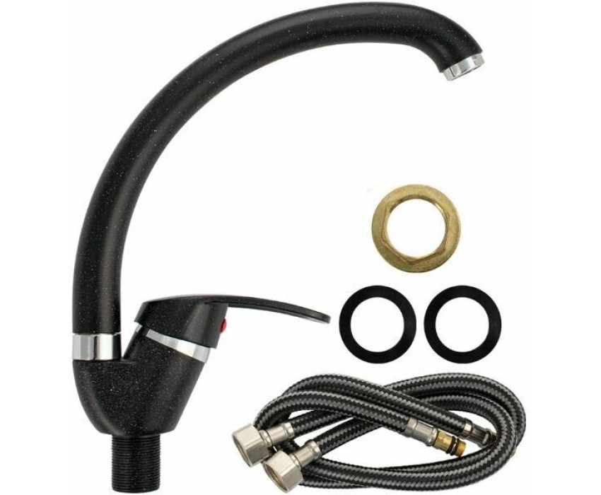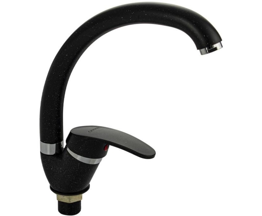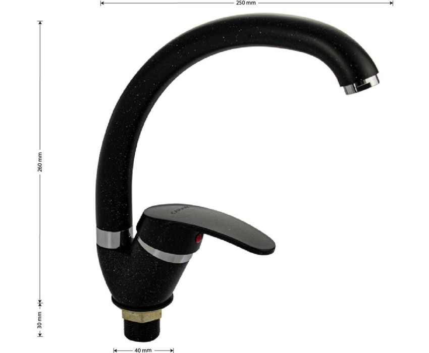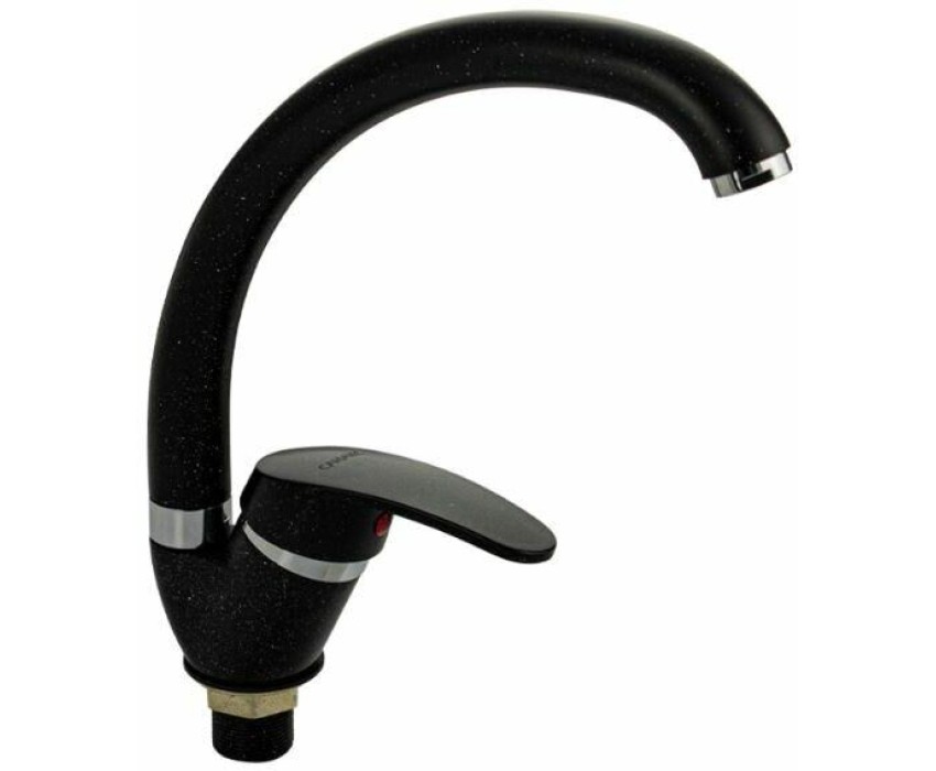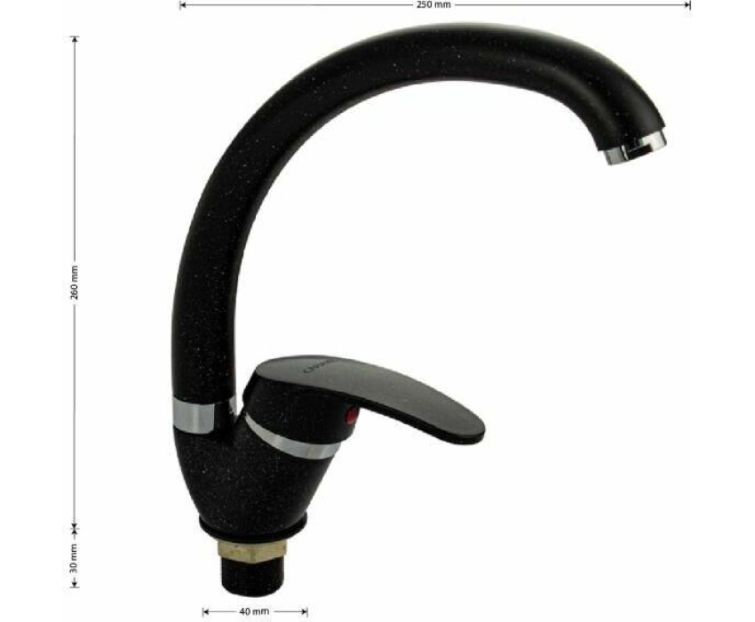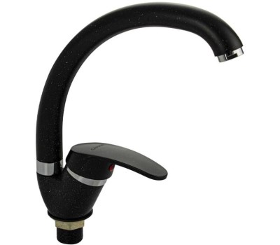Смеситель для кухонной мойки и раковин, литой матовый корпус, из нержавеющей стали и аллюминия, с С - образным изливом, шаровый. Цвет черная эмаль с вкраплениями. Крепление резьба - гайка, картридж d = мм, ручка литая. Аэратор для экономии воды. Такая модель может использоваться на домашней кухне, на даче, в медицинских учреждениях и общественных местах. Габаритные размеры: высота 260 мм, длина 250 мм, диаметр посадочного седла 40 мм, длина резьбы 30 мм, длина подводки 400 мм. Вес - 0,65 кг, объём - 0,00357 м3. В комплекте паспорт, корпус с изливом, подводка 1/2, крепеж, набор прокладок.